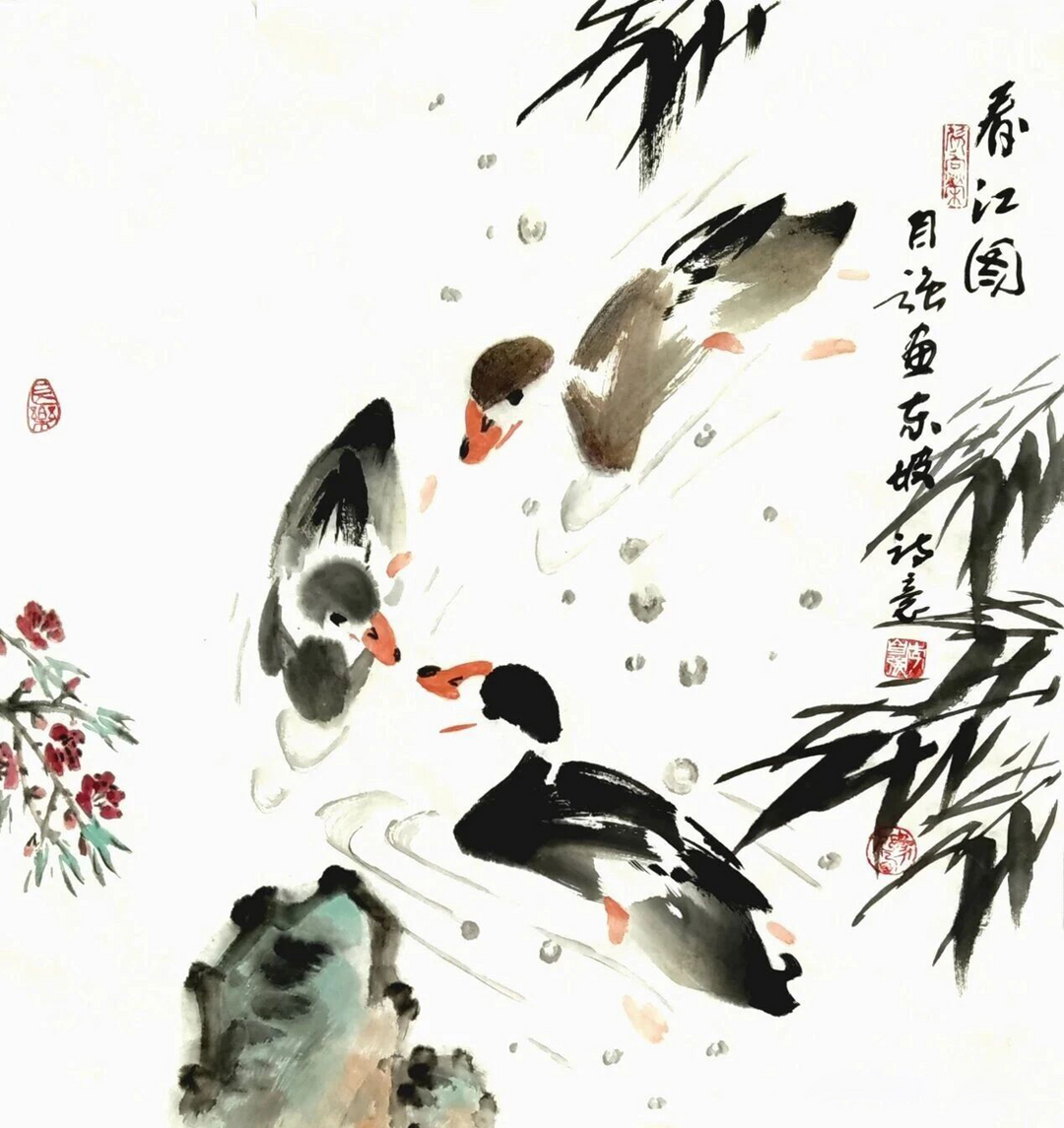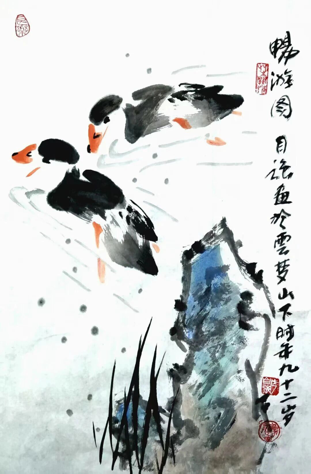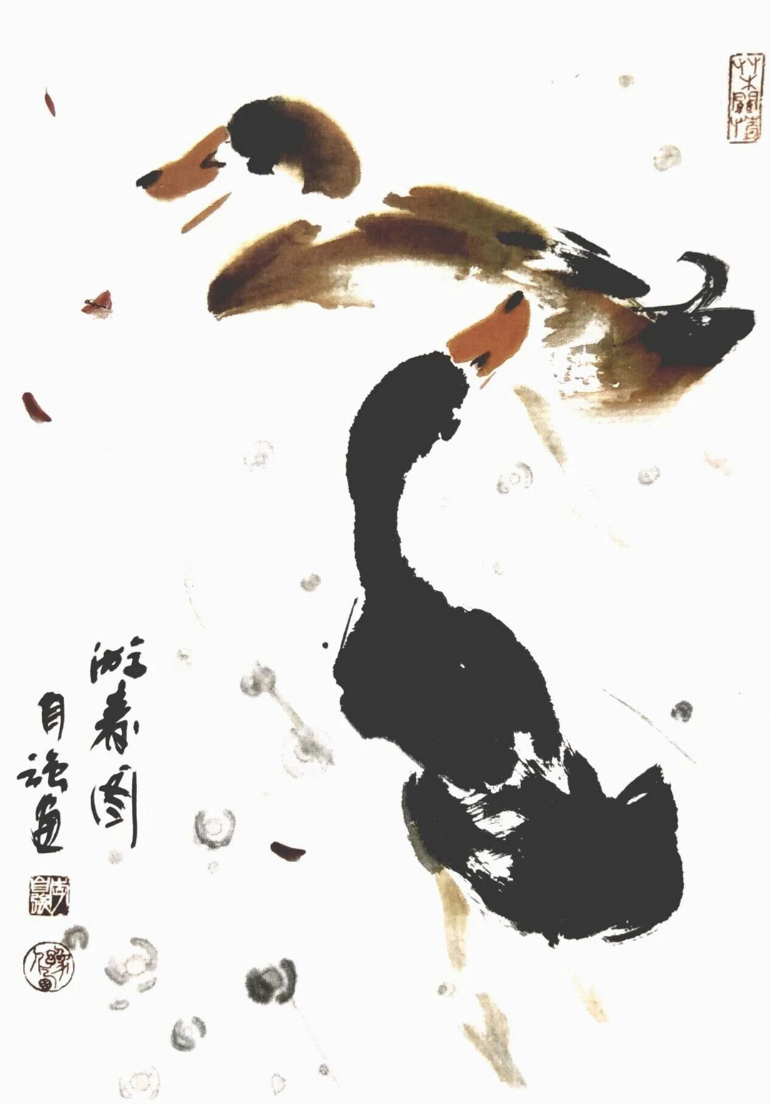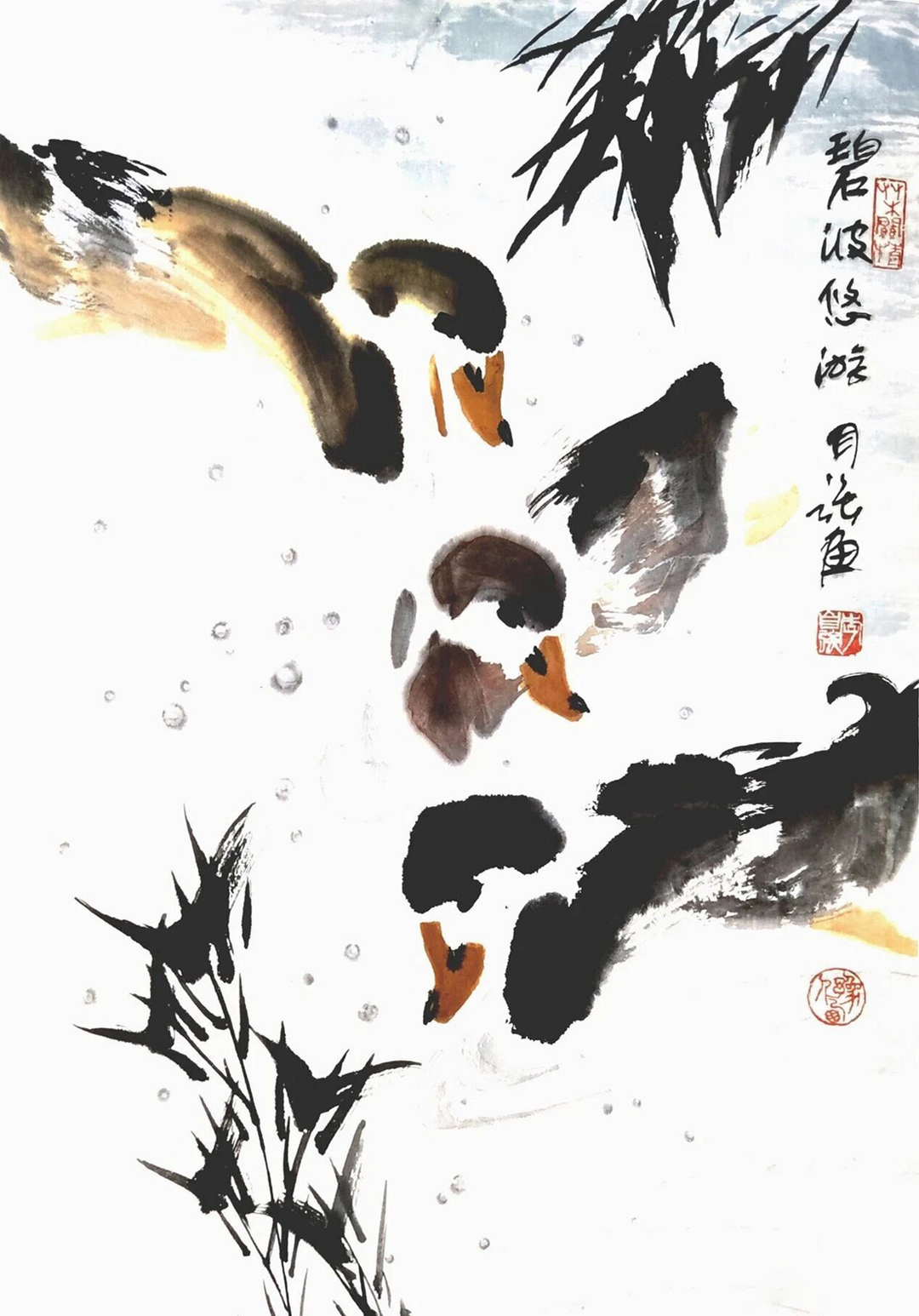 其笔下之鸭,姿态万千,气韵相连。双鸭相依含温情,三鸭结伴自在游,群鸭嬉戏添喧闹;或静卧安闲,或振翅追逐,或低头觅食,或回首顾盼。或配以花草、竹枝、河石、芦苇等,满幅皆是自然生机。荷塘白鸭清雅脱俗,乳鸭憨态可掬,尤显可爱,麻鸭意蕴醇厚,一题一境皆成佳构。在一幅《戏鱼图》,更将水墨写意与西画技法画水精妙相融,三只鸭子追逐一条小鱼,迂回周旋,小鱼极力逃窜,三鸭紧追不舍,整个画面充满旋律动感,意趣盎然,耐人寻味。