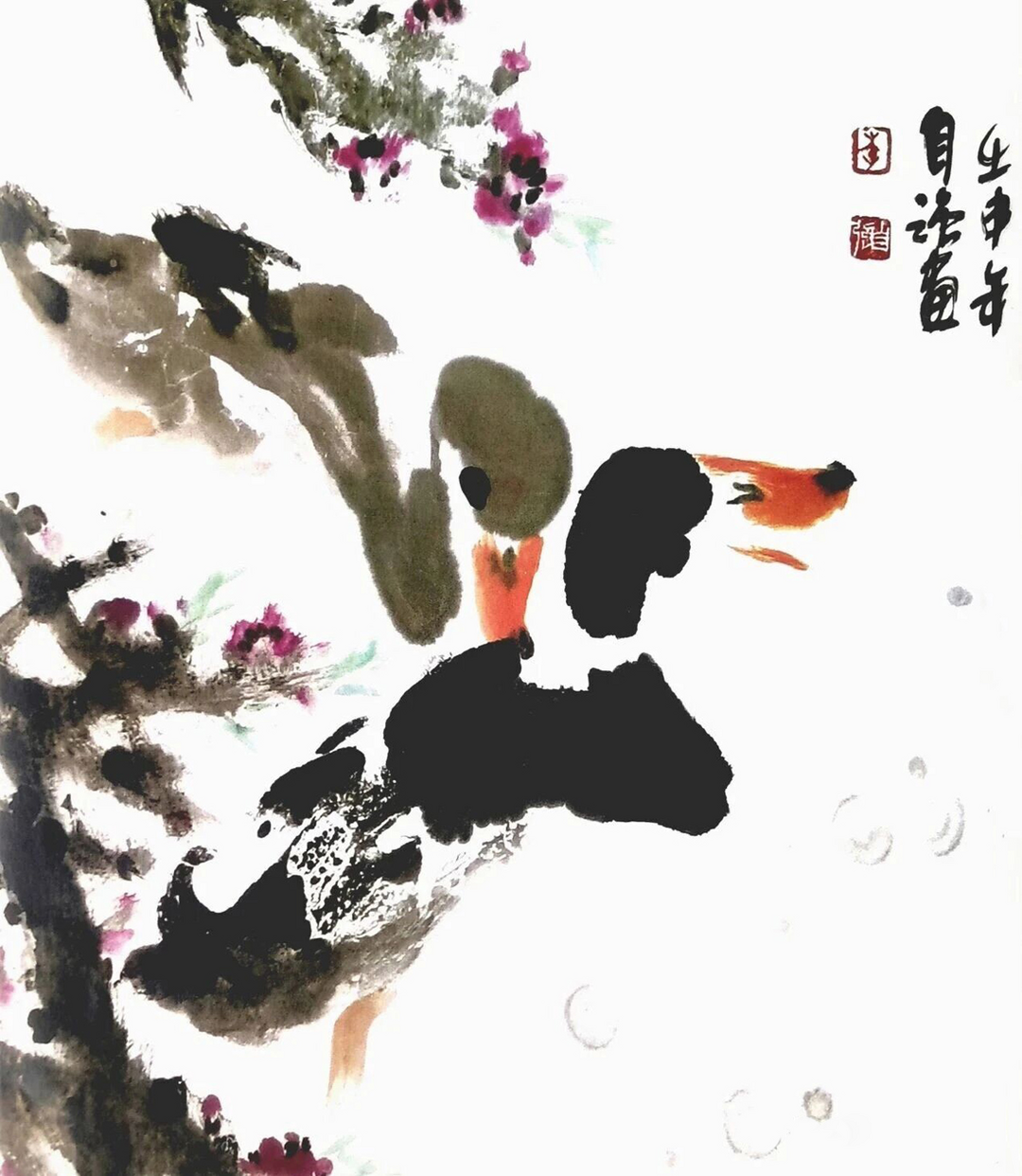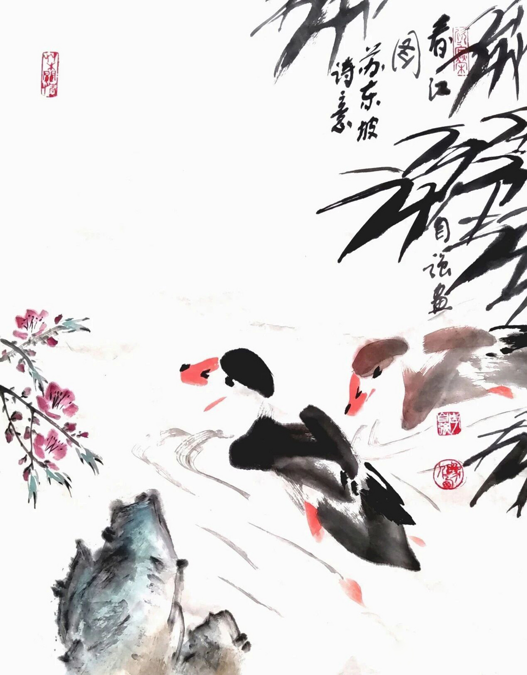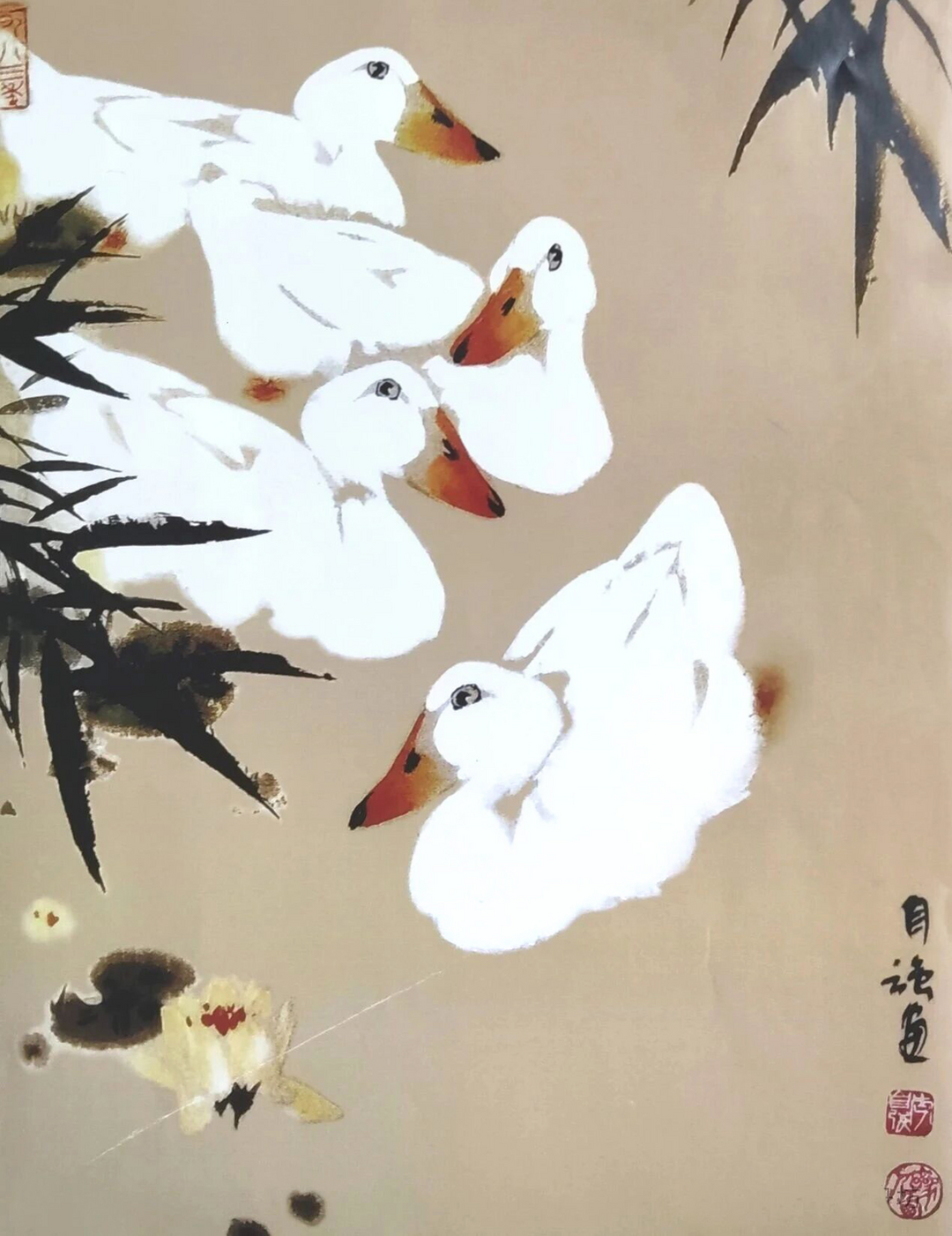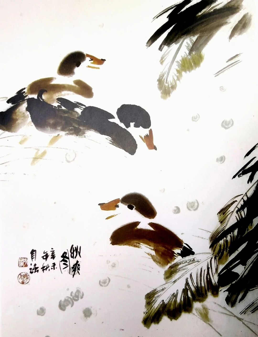 其笔下之鸭,姿态万千,气韵相连。双鸭相依含温情,三鸭结伴自在游,群鸭嬉戏添喧闹;或静卧安闲,或振翅追逐,或低头觅食,或回首顾盼。或配以花草、竹枝、河石、芦苇等,满幅皆是自然生机。荷塘白鸭清雅脱俗,乳鸭憨态可掬,尤显可爱,麻鸭意蕴醇厚,一题一境皆成佳构。在一幅《戏鱼图》,更将水墨写意与西画技法画水精妙相融,三只鸭子追逐一条小鱼,迂回周旋,小鱼极力逃窜,三鸭紧追不舍,整个画面充满旋律动感,意趣盎然,耐人寻味。