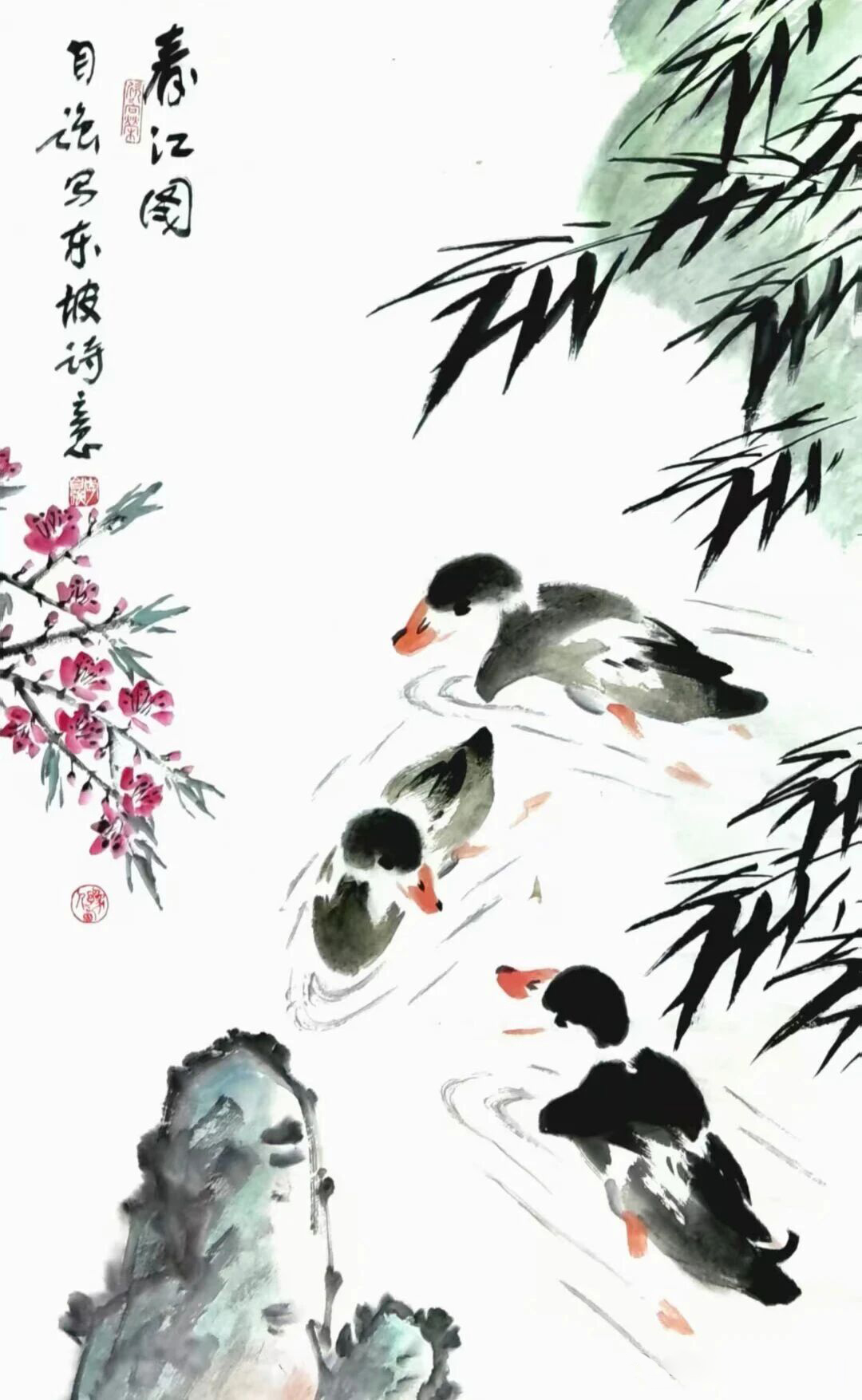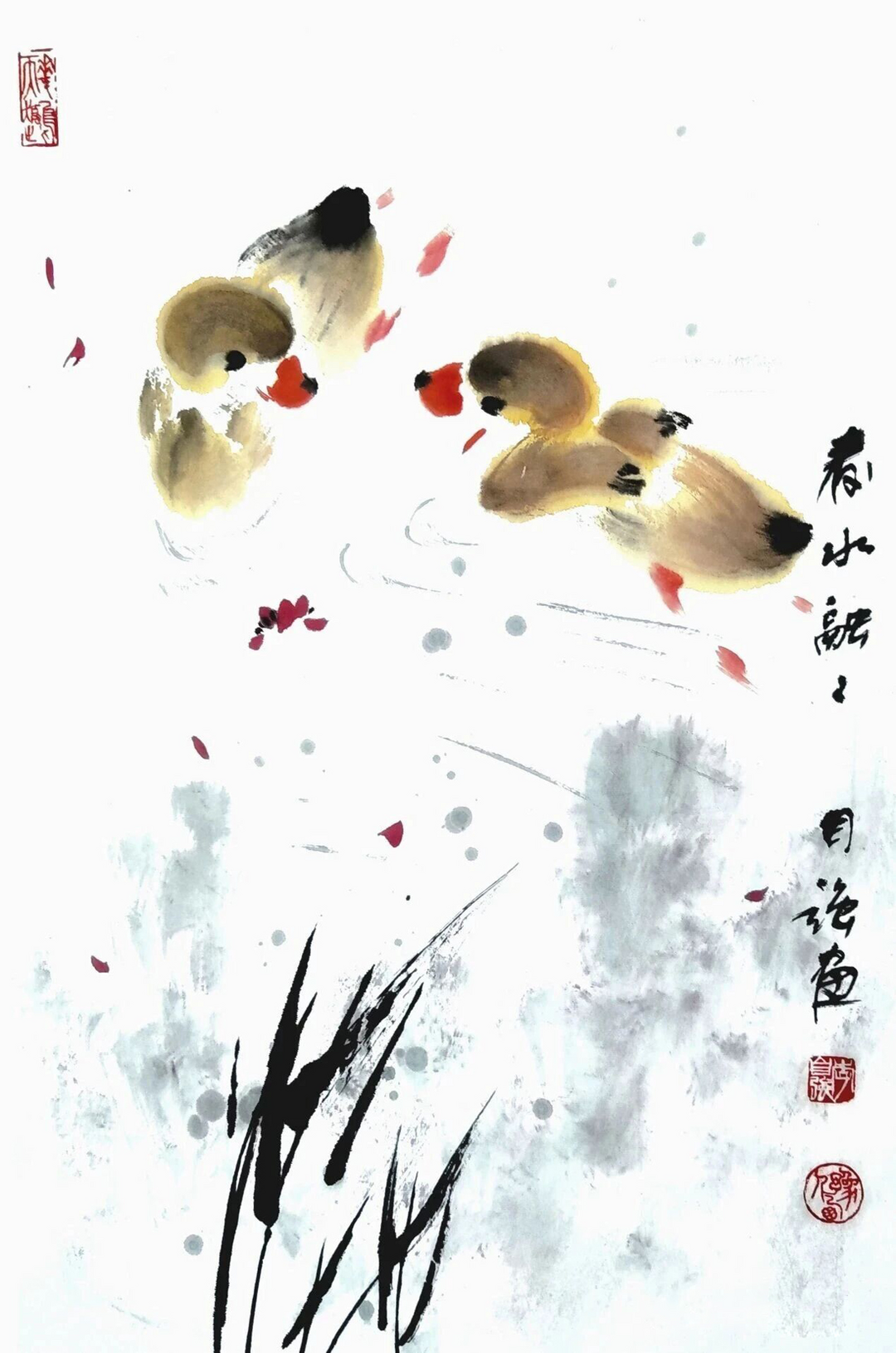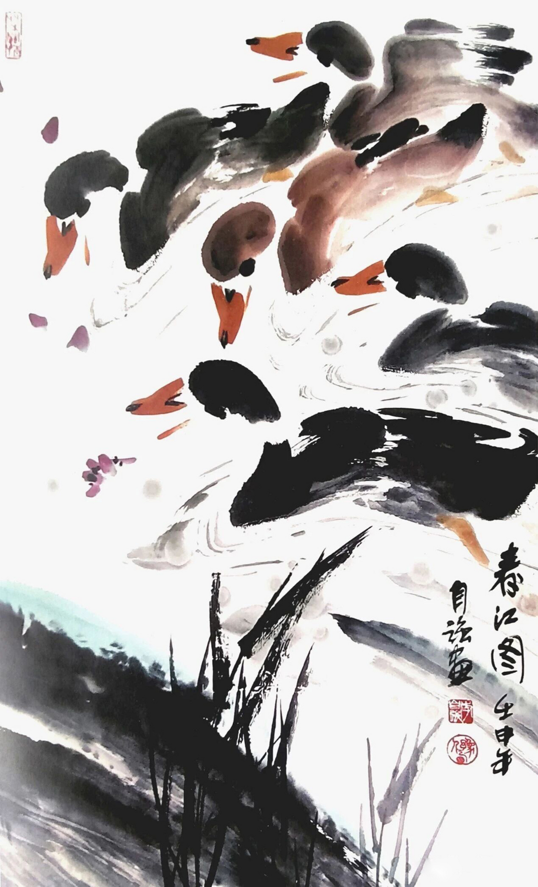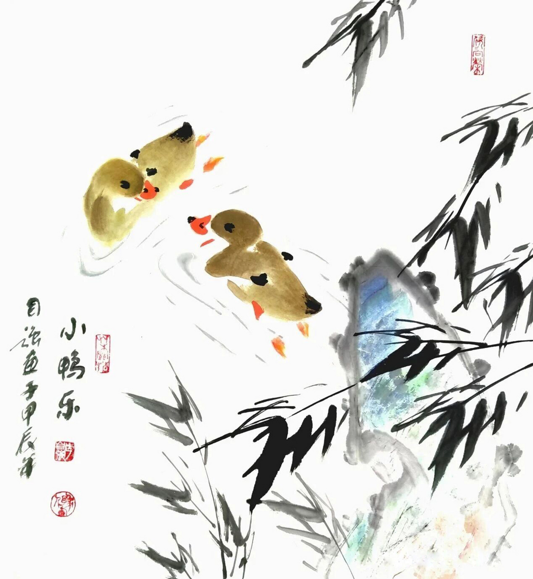 其笔下之鸭,姿态万千,气韵相连。双鸭相依含温情,三鸭结伴自在游,群鸭嬉戏添喧闹;或静卧安闲,或振翅追逐,或低头觅食,或回首顾盼。或配以花草、竹枝、河石、芦苇等,满幅皆是自然生机。荷塘白鸭清雅脱俗,乳鸭憨态可掬,尤显可爱,麻鸭意蕴醇厚,一题一境皆成佳构。在一幅《戏鱼图》,更将水墨写意与西画技法画水精妙相融,三只鸭子追逐一条小鱼,迂回周旋,小鱼极力逃窜,三鸭紧追不舍,整个画面充满旋律动感,意趣盎然,耐人寻味。