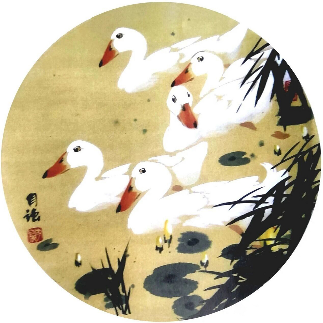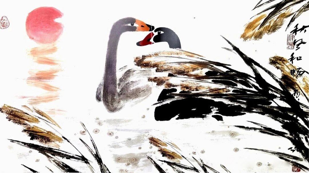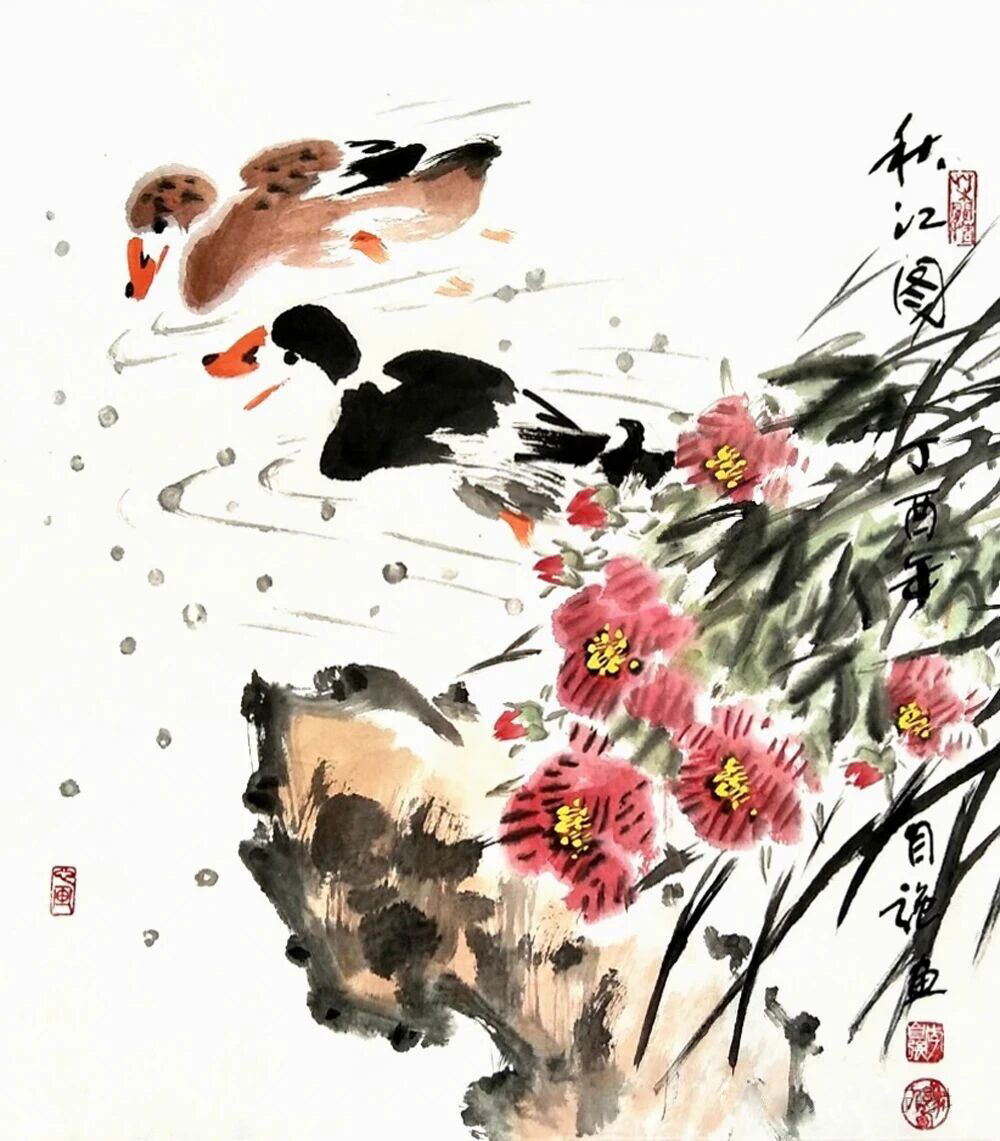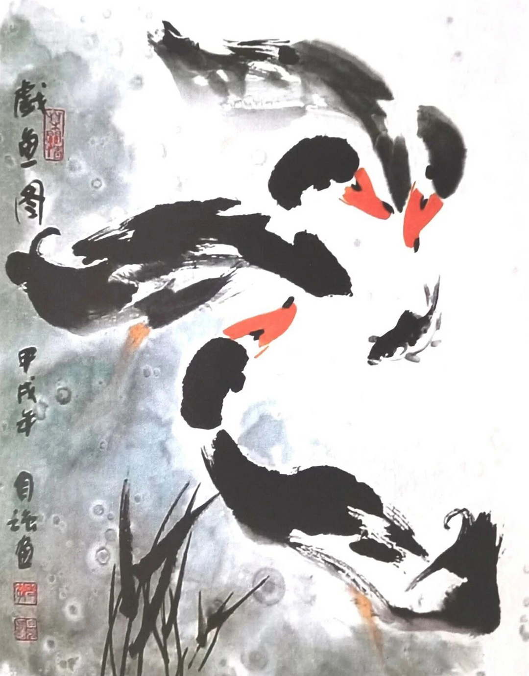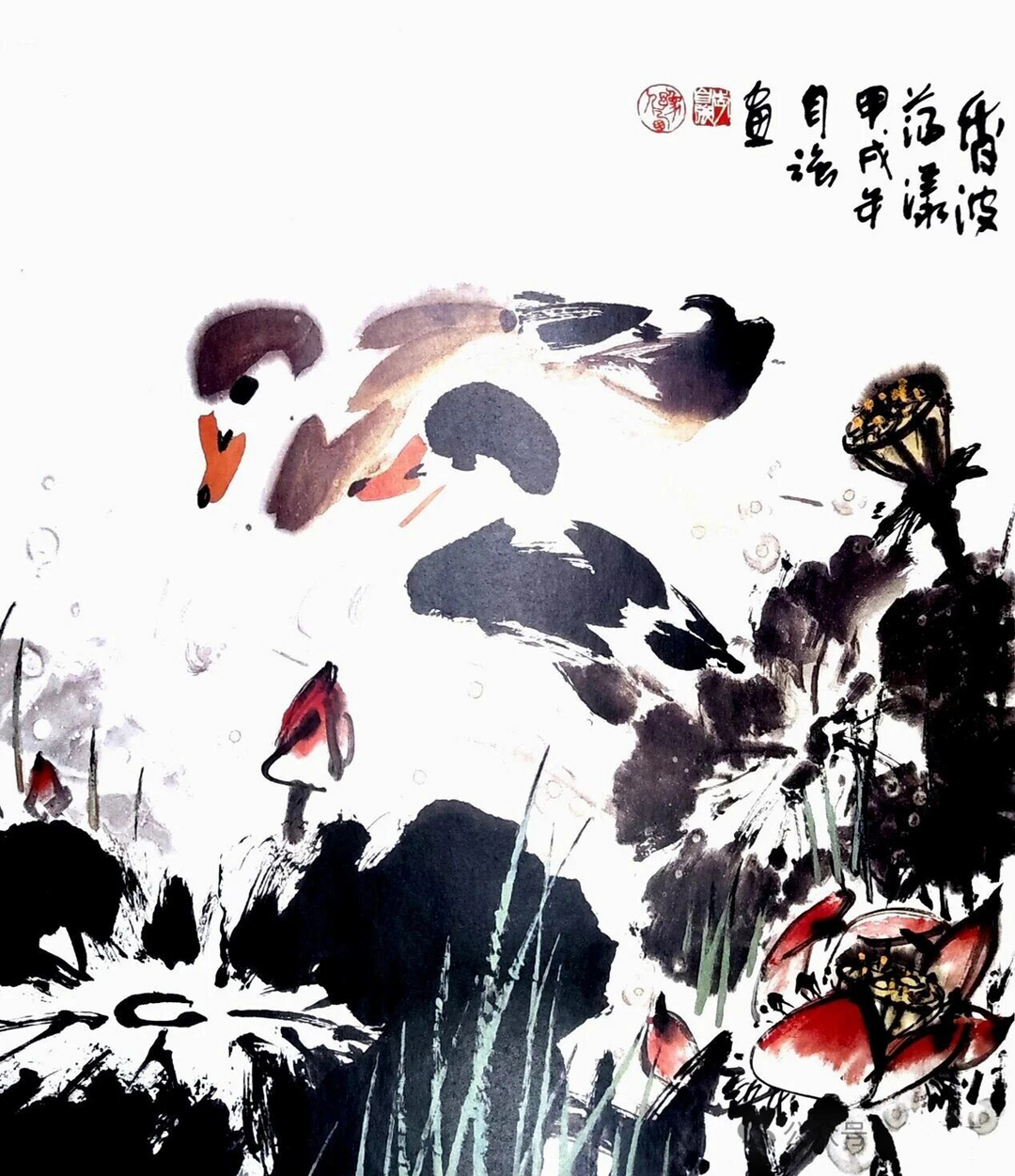 其笔下之鸭,姿态万千,气韵相连。双鸭相依含温情,三鸭结伴自在游,群鸭嬉戏添喧闹;或静卧安闲,或振翅追逐,或低头觅食,或回首顾盼。或配以花草、竹枝、河石、芦苇等,满幅皆是自然生机。荷塘白鸭清雅脱俗,乳鸭憨态可掬,尤显可爱,麻鸭意蕴醇厚,一题一境皆成佳构。在一幅《戏鱼图》,更将水墨写意与西画技法画水精妙相融,三只鸭子追逐一条小鱼,迂回周旋,小鱼极力逃窜,三鸭紧追不舍,整个画面充满旋律动感,意趣盎然,耐人寻味。