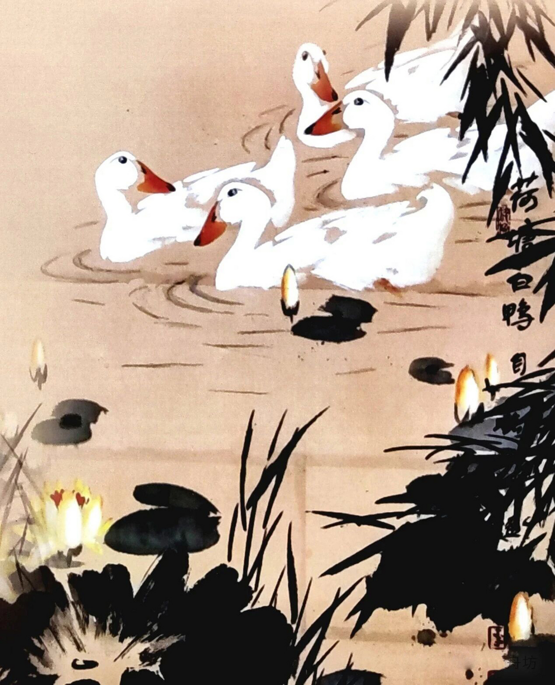 先生写鸭,尤重留白。不绘实景水波,仅以数道弧线傍鸭轻勾,便觉清波荡漾、水意盈然。正是“计白当黑、以虚代实”的至高境界,于留白处见天地,于极简中藏万象,尽显传统水墨的空灵智慧与东方哲思。