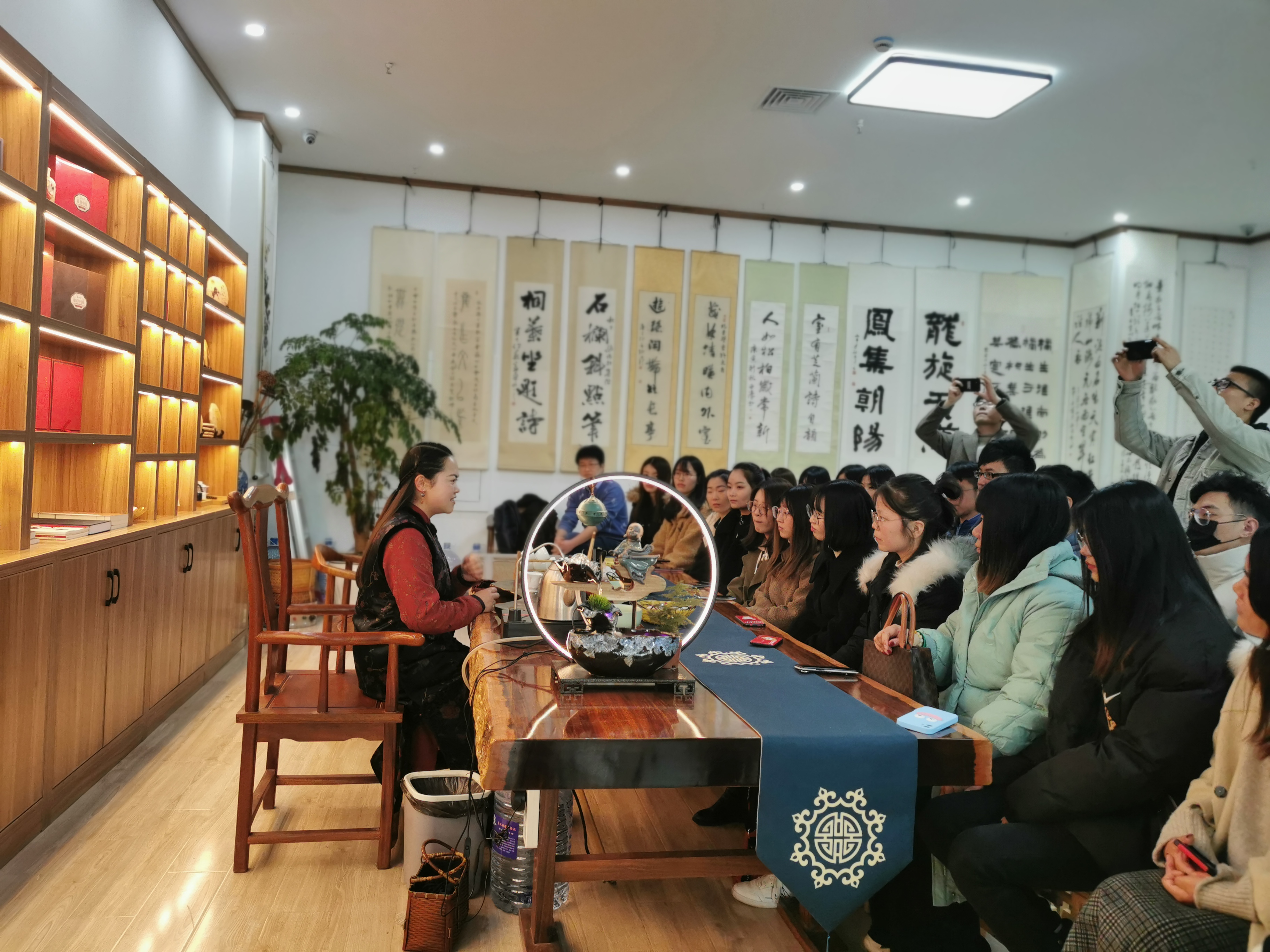 大家围坐一席,静心聆听茶艺师的耐心讲解和分享,郑老师由浅入深的讲解,不仅让我们认识了六大类茶,也学到了很多专业的茶知识和丰富的茶文化,上到茶文化的起源、传播和影响,下到日常饮茶的讲究和好处,甚至于茶具、水温、倒水方式及礼节等的讲究。更重要的是,在郑老师的启发下,让我们通过“三杯两盏淡茶”品味到了人生不同阶段的滋味,虽处闹市,也能使内心获得一份片刻的宁静。