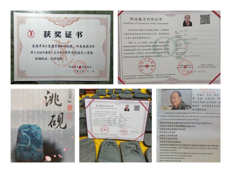 李海平简介:艺名:拼子(干工作有点拼命三郎的架势),男,汉族,1977年生于中国洮砚之乡,今甘肃省卓尼县洮砚镇制砚世家,著名的国家级洮砚传承人的嫡孙,师从制砚名家李茂棣、刘爱军、王玉明等中国非物质文化遗产洮砚传承人及省级工艺美术大师,是货真价实的非物质文化遗产传承人的嫡孙。擅长雕刻古今人物、山水、花鸟虫鱼,其作品多次在国内外各省市工艺品大赛中获大奖,并赢得荣誉。现为中华传统工艺名师、中国工艺美术协会会员、甘肃省工艺美术大师、甘肃省省级洮砚代表性传承人、甘肃李海平洮砚传承文化发展有限公司总经理、甘肃卓尼洮砚李海平传习所传承人、甘肃润玉洮砚艺术研究院副院长兼秘书长、甘肃卓尼李氏洮砚研究会会长、甘肃卓尼洮砚协会副会长、甘肃省工艺美术协会理事、甘肃省农村实用文化人才正高职称。海平先生以其刻苦勤奋及其累累硕果,自然成为极有潜力的青年雕刻师之一,也当仁不让地成为洮砚行业的工艺专家和领军人物,并受聘为甘肃省工艺美术协会“百花奖”评审委员会评委。