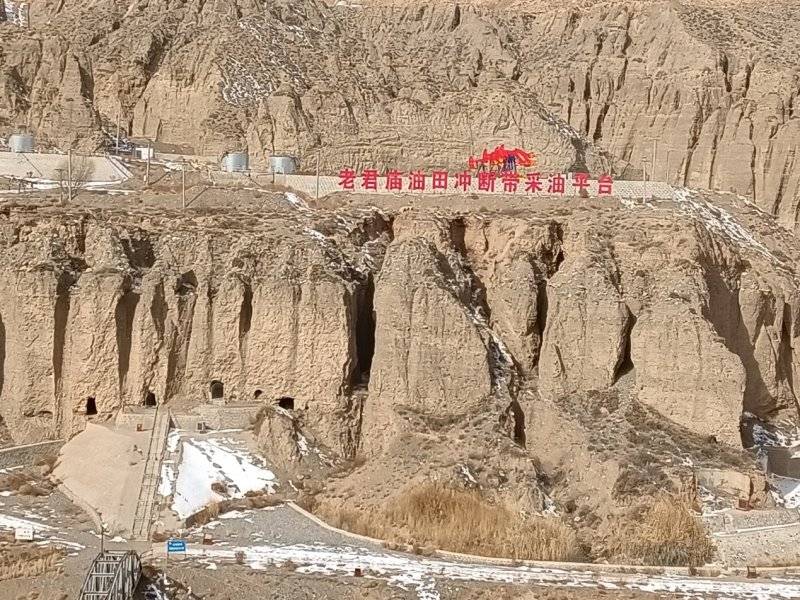 图片:老君庙 我站在“老一井”身旁,久久沉思而不愿离开。从“老一井”来到石油峡谷,我一眼望见了峡谷坡下朝着西南方向的一个个窑洞,这些窑洞曾经都是采油工们的住房,其中还有铁人王进喜住过的窑洞。我弓身低头走进一孔七八平方米大小的洞内,发现里面还残留着采油工生活过的痕迹:早已坍塌的土炕上还剩有几根铺炕用的麦草,它们仰起头来随风晃动,好像是和久违了的人儿打声招呼;洞口处是“厨房”,三块石头支成的炉灶还保留原来的样子;窑洞内的墙壁上有许多挖好的小洞,应该是放置烛灯或是其他生活用品的;高起的土台子应该是饭桌;窑洞内的墙壁被烟火熏得很黑,我依稀发现了当时的工作记录……在峡谷的最深处,有一条不息奔流的河水,源头来自于祁连山的冰雪消融。虽是春季,但河流的大部分仍被数尺厚、透明状的冰层所覆盖,能够见到的水流在冰层下缓缓流动,清澈无暇,给人刺骨的寒意。