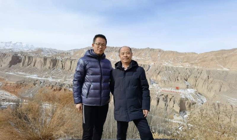 图片:作者和表弟董绍武(左) 绍武是子承父业。这位生长在河西走廊的奉化溪口东山人,现在是玉门油田第二代石油人,他讲一口普通话,但尾音中已留下动听的西部方言的音色,他的微信名是“戈壁人”。我沉浸在他的介绍和解说中,不知不觉,便穿过了旧玉门市的解放门,路边的建筑渐渐稀少。当我们缓缓爬上老君庙东北侧的坡头,映入眼帘的是白雪皑皑的祁连山麓。登高远眺,极目楚天舒,湛蓝的天空,蚕丝状的薄云洁白无瑕,缓缓游动。老君庙石油采区仍然被厚厚的冰雪所覆盖,那是一条通向祁连山深处,被祁连雪水荡击冲刷了亿万年后才形成的石油峡谷。老君庙油田自一九三八年勘探开采以来,虽已过去了整整八十四年,但我所看到的油田采区的工作环境,依然十分恶劣,而且超出了我的想象,这种考验人类意志力的残酷的生存生态让我震撼。