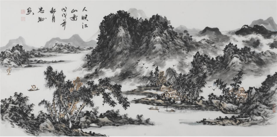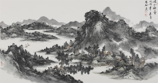 《秋韵图》 书画同源,陈忠洲的绘画与书法有同归之处。此源乃作者之心性,脉动而通脱。我们看到陈先生的画,一如看到一纸活脱脱的云和山,迷雾其中,不能自已。虽然没有见过陈先生作画,但能想象他定是把写生时的感受通过记忆生发于纸面,由近及远、笔笔恬淡、自然流淌、虚实相生、开合得势、隽秀茫远、气韵风生…此中妙道,也只有画家本人最知深处。陈先生山水多表现山之秀态,不温不火,观之,不敢高声大调。画面多上为远山,脉络迷茫;下为泉流溪涧,中以浑峰挺立,辅以简淡云烟,联想楚天。其径直通接传统根基与民族关照。