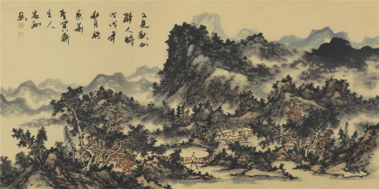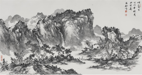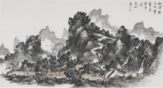 中国绘画历来讲究用笔用墨,是通过笔墨来书写艺术形象。笔墨取于物,发于心,为物象、心之迹。画家在写物象的形象中,以笔取其气,以墨取其韵,用笔讲究书法功力。陈忠洲先生以书法闻名,尔后习画,始终坚持作书,很自然地以书法入画法。所以在他的山水造型中线的运用,皴、擦、点、画皆见书法笔力,浓、淡、枯、湿包含万千变化,使画境清新有韵,诗情浓郁。国画大师黄宾虹一向强调“国画民族性,非笔墨之中无所见”。所以,陈忠洲先生是典型的国粹派,他始终坚守笔墨底线,不慕时流,不追新潮,总是清醒地、坚实地行进在艺术征途上。