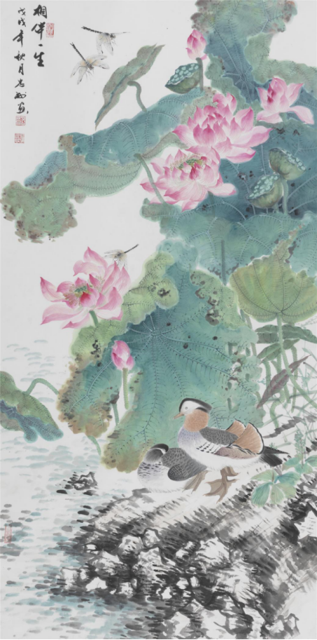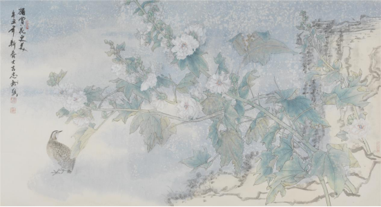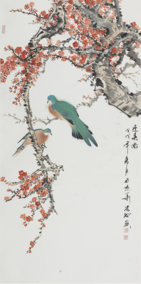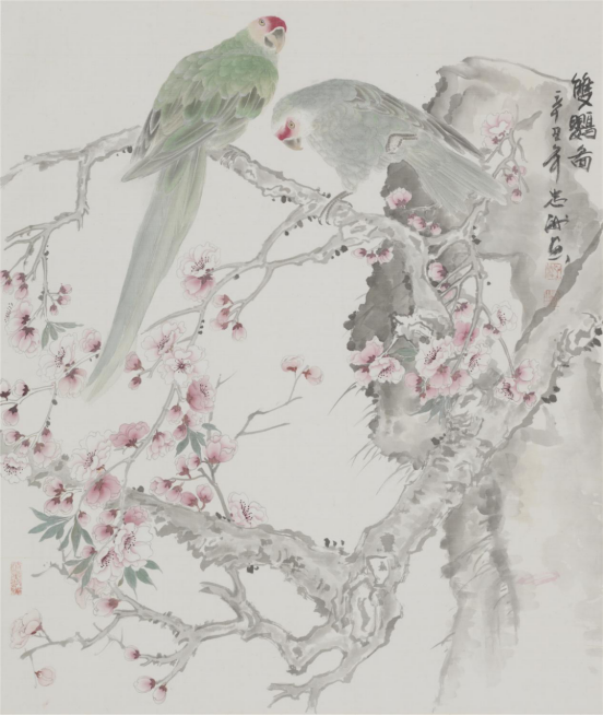 《双鹦图》 2005年他的作品入选第五届中国书坛新人作品展,2005年他的扇面书法入选“全国第二届扇面书法展览”,2006年他的书法作品入选全国首届行书大展,2007年他创作的书法作品入选全国第九届书法篆刻作品展览。2019年其美术作品《晨》入选中国美协2019雨花满天—全国中国画作品展览,2019年其美术作品《待归故园》入选中国美协第二届“江海门户通天下”全国中国画作品展览,2020年其美术作品《繁花际会》入选中国美协第三届“白山黑水·美丽四平”全国中国画作品展览。其作品多次赴韩国等国家和地区展出。