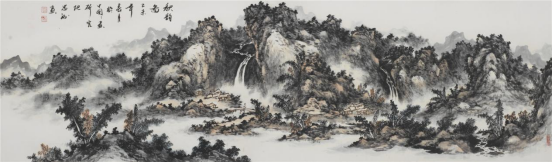 陈先生的山水画注重线条锤炼和笔墨累积,扎实的绘画基础,使作品生活气息浓重,构图饱满大方,追求凝重、浑厚、博大的气势,用笔深得抑扬顿挫之妙,厚重无板滞之迹,秀逸无浮滑之病,既有满纸淋漓的泼染,亦有比比分明的细写。其作品无论是尺寸小幅的性灵挥洒,还是鸿篇巨制的精心描绘,画幅中的重重山峦、悠悠浮云,都是作者对祖国山水风物的浓缩于钟爱,观其画给人一种身临其境、心旷神怡的美感。其山水画创作立足传统,着意创造,力争每幅作品的面目均异于前贤、师友和自己,呈现出较强的个人风格。
