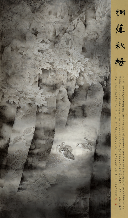 认识开刚先生已逾二十载,二十年前,我家书房里便挂有他的一幅传统工笔画作《梧桐·鹌鹑》,画面很满,青绿满目,几只鹌鹑“穿行”林间,很是生意盎然。但仔细审读,这幅作品,仍然是兼工带写,用色、构图中规中矩;二十年后,再来观赏王开刚的工笔重彩之作,恍然大悟:画乡萧县给了他扎实的基本功,线条、水墨、写意、传神等等,而走出萧县后的他乡水土滋润,那些当代工笔书画大家们的言传身教,却加速了王开刚艺术创作的“与时俱进”,他由传统工笔画步入了工笔重彩的崭新天地。