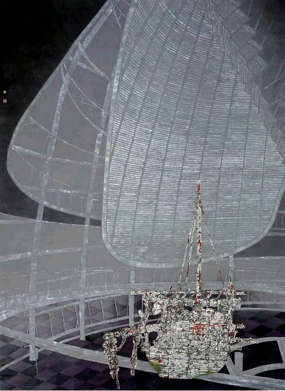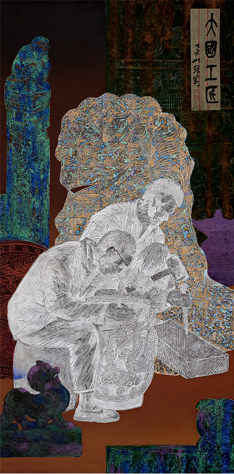《丝路·丝路》。画面如诗如梦,现实生活中并不存在的赤红驼队,浩浩荡荡“漂浮”在沙漠胡杨前方,超越时空的平面设计给‘人以强烈的时空穿越感,而西部的神奇和古代丝绸之路的内涵,也通过汉唐飞檐、画像石刻、斑驳佛头、陆离陶罐、五彩车轮等元素符号,有力地烘托了出来。这幅作品,使用了新的重彩材料、技法,画面中金属箔的运用,很好的表现出历史厚重感,背景设色黑和红的渐变,令画面神秘感陡增,青、绿、白、金几大色块的对比冲撞,形成了巨大张力。观者可以从有限的二维绘画平面感受到历史纵横空间交错的多维空间。整幅画面以张扬恣肆的顽强生命姿态,诠释了丝绸之路的昔日辉煌,并蕴含继续见证新时代一带一路的新生机、新活力。