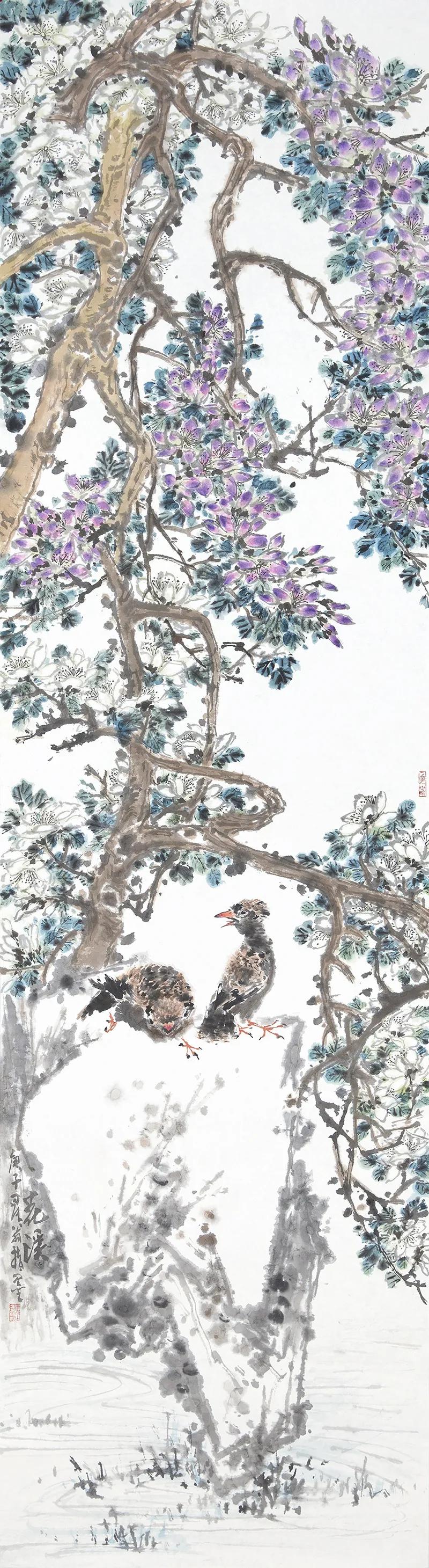 王星和他的花鸟画 江阴长泾古镇锺灵毓秀,人文荟萃。泾河水穿过镇区,蜿蜒流向长江。王星的家位于长泾老街的西端,傍河面南,迴廊临水,庭院小筑,古树葱郁,兰蕙生姿,鸟语花香。品尝了泾水的味道,看惯了泾河潮涨潮落,王星把对家乡和泾水的一份情感,以花鸟画的形式,传达得充沛,也格外亲切。