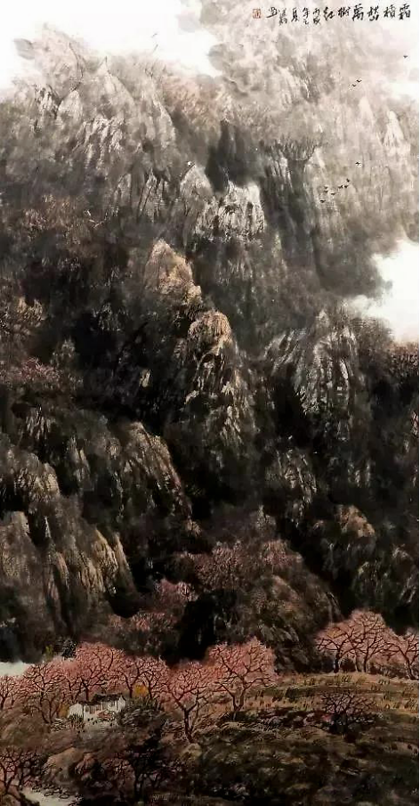 其作无一不呈现着从画 家心间流淌而出的蓬勃向上的生命力,欣欣然,活脱脱,呼之欲出,淋漓尽致地展现出东方水墨的艺术精神。 在笔墨语言的运用中,李建设师承传统又能以自己的感受和理解赋予其作品以时代精神,成功的融入了书法笔意,放笔抒怀,表情达意,把对家山的情感融注其中,形成富含文人气象的笔墨语言特色。