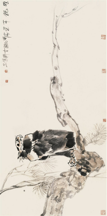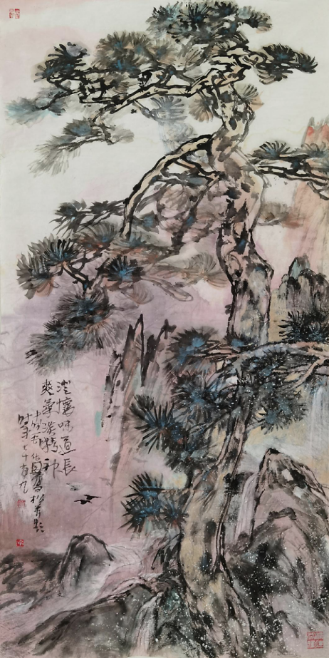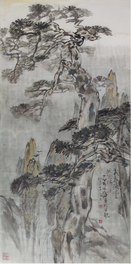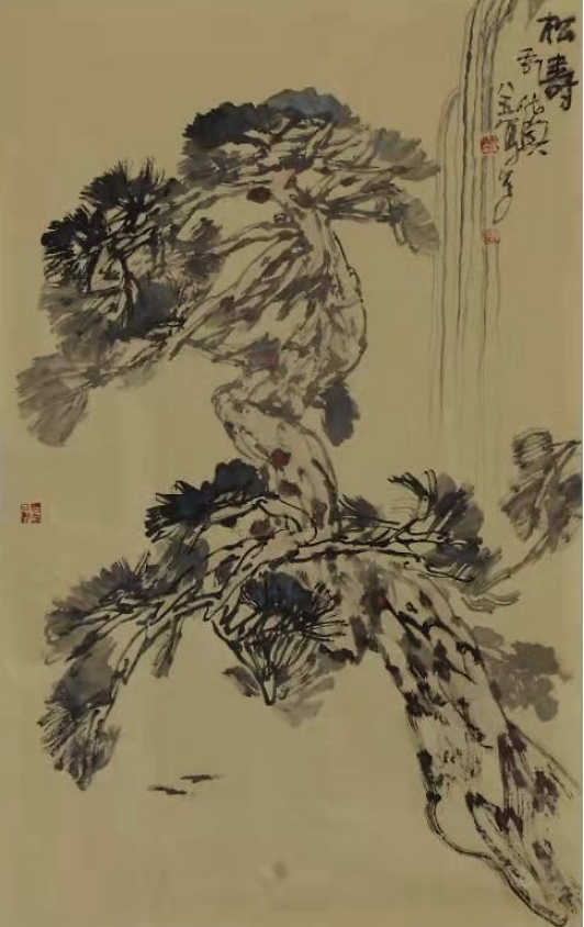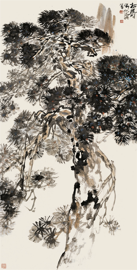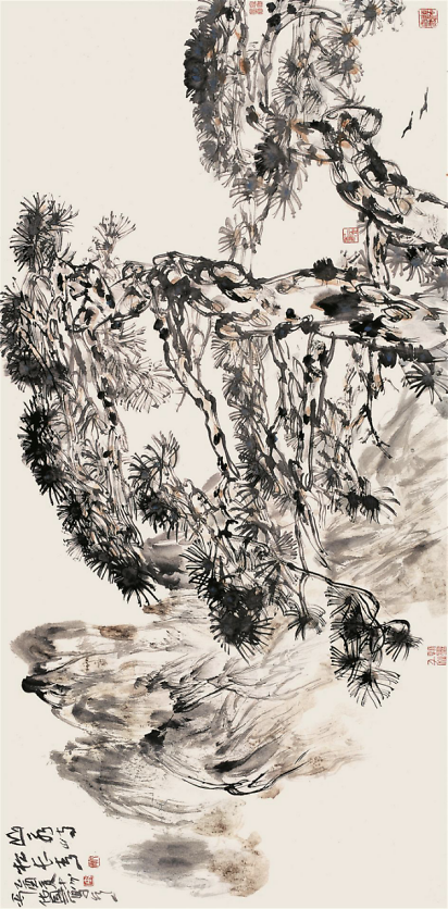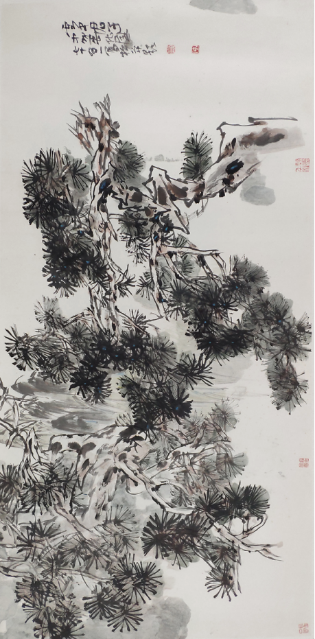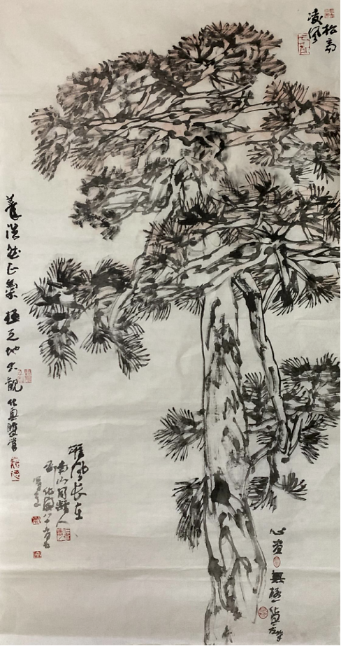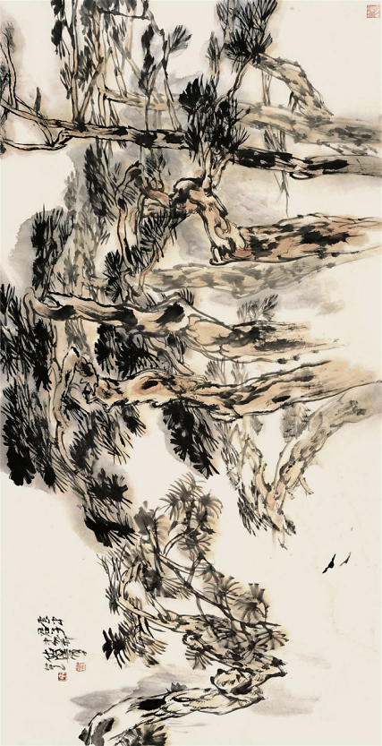 太多的禹先生的阅历,太多的只有自知的种种日复一日,年复一年的积压在心头的过往,禹先生都是在自觉不自觉地通过“松”的种种神态给以借喻,从而让松来代他言说,表述他的无数的心头郁积,这些也都让他发现只有画松始能令他尽兴地泄泻他的无数内心感慨!一个温文内向者的借题喷发与抗争。一个不屈不挠者大声疾呼与放歌,因而他认为这是他后半生以生命相许的艺术生涯。