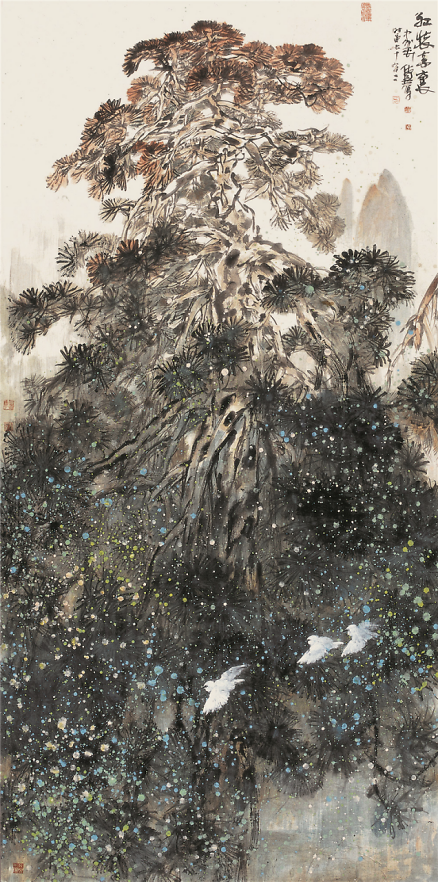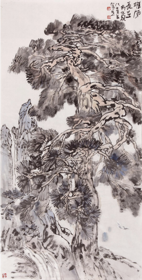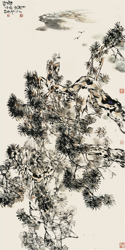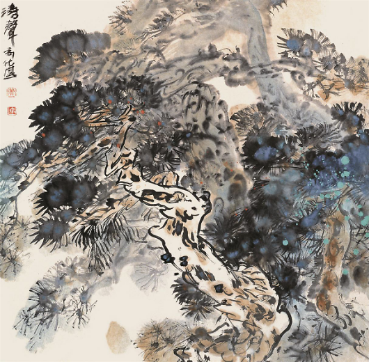 中国绘画有谢赫的“六法”千年箴言式的保驾引航,才终于没有像西方绘画那样,花样不断翻新,导致自乱阵脚,自拆殿堂,这是中国画和画家之大幸,坚守使它成为世界艺术中的独秀孤峰。“从心所欲,不逾矩”,有规则的自由发挥,彰显出中国画的沉稳飘逸,化兴君之苍松系列多变而又成法入理。 如今他笔下之松,既脱去西画自然写生之表相,又得益于西画写生之实功;既少见前人笔下画松之旧容,又得益于传统笔墨之神功,二者使他培育出属于他的系列新松,他突破了传统对松树认知的有限性,拓展了松树审美无限语境,并且实现了他从西画到中国画的华丽转身。