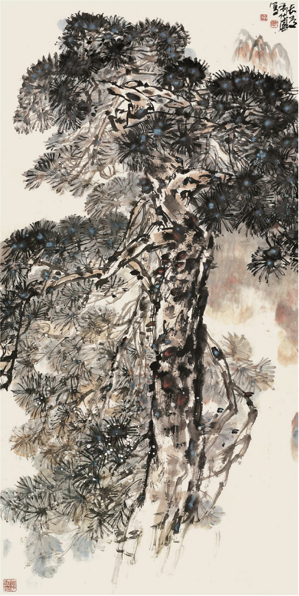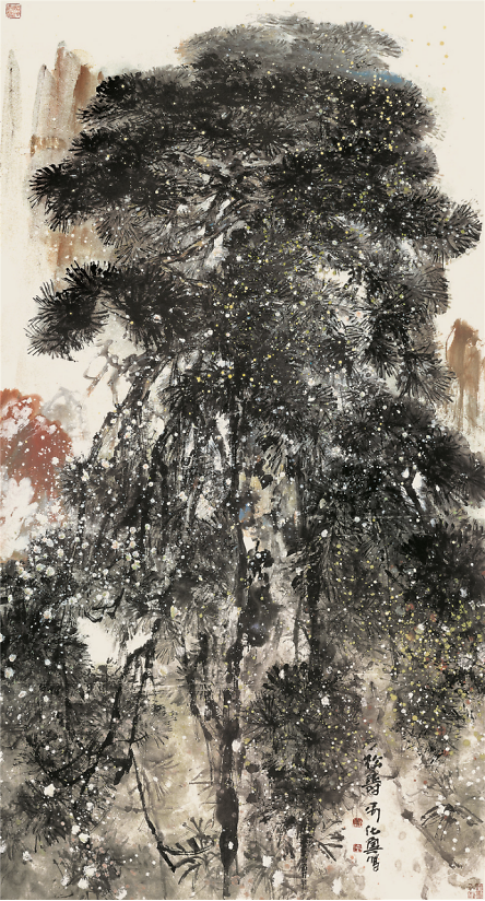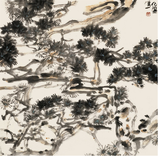 在化兴的画中可以感受到他和传统意念的共鸣,同时也有对传统归属的冲击,他的挣扎和努力,他以苍松为载体,努力去发现自我、表现自我,除了苍松的崇高精神气质:苍劲有力、坚忍不拔、傲风寒、挺福寿之外,他的松开始显示多姿多彩,甚至寓有人性的东西,最终在他的苍松世界中,出现了种族的繁荣景象。