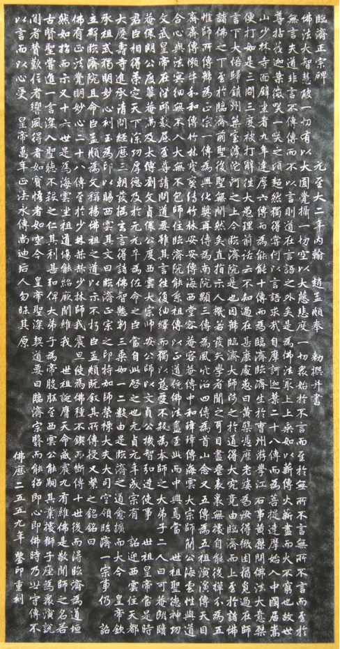 因为曾经担任临济寺方丈有明老和尚的助理,并受聘国学论坛版主十几年,鉴印先生的佛学造诣颇深,在国学研究领域颇多精辟独到的见解和论述,深受学术界关注,国学论坛管理组评价他“对国学论坛的发展做出了重要贡献”。这也是他能够使碑文增补工程得以完成的一个学术保证。譬如碑文“惟此大城,环□所践 ”一句,有释文将泐损之字录为“异”,而鉴印先生同样是在对原碑残存字形处进行了细致的研究,又遍查佛籍文献并无“环异”之词,且文意不通,在细勘漫漶处下部隐约所显方形如日字和捺脚后,排除了“异”字的可能。查所有下部为“辶”旁字,皆与文意不通;又查所有下部为“日”旁字,唯“智”字贴合文意,即“环智所践”。智者智慧,般若智即佛智。《韩非子·显学》云:“智,性也。”《淮南子·俶真》谓:“智者,心之府也。”《管子》说:“四时能变谓之智。”“环智”,则指围绕佛法智慧去实践、履行。仅仅一字之别,彰显的是严谨的治学态度和悬殊的碑文意境。 正是无数个这样严谨入微的认真工作,才使得对《隋龙藏寺碑》书法与文本进行整体研究进展的卓有成效。经过数个寒暑息交绝游、闭门谢客如同禅僧的闭关修行,在无数次查阅了数以百万字计的涉及隋碑的历代史料、佛学辞典经传的漫长时间里,鉴印先生并对魏晋南北朝笔法悉心揣摩和对龙藏寺碑书法精髓得悟于心后,先生终于完成了中国书法史上首次对《隋龙藏寺碑》全部文本的破译补阙和对原碑再现其开皇原貌的实验性复原重刻。21011年11月,他的研究论文“《隋龙藏寺碑》泐损残缺字辨识考析”发表在《中国文物报》,又引起文物界、书法界关注。