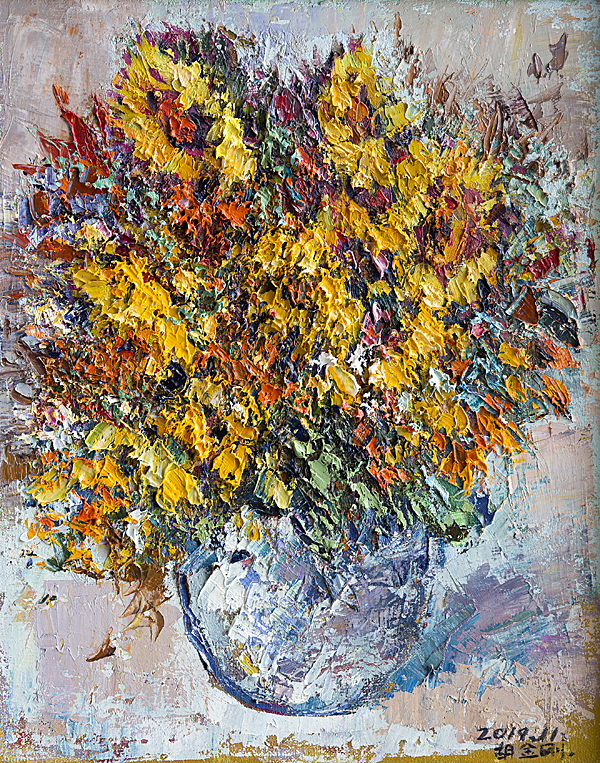 ![]() 《坝上秋色》油画60×80cm 一、喝着“西家的红酒”,让光与影纵情地舞蹈 胡金刚先生2003年毕业于首都师范大学美术学院油画系,师从刘孔喜教授与段正渠教授,可以说是油画科班出身了。数十年来,胡金刚是法国印象派最忠实的拥趸,以19世纪60年代法国印象派大师莫奈、马奈、德加、塞尚、雷诺阿为艺术膜拜的偶像,以“一切色彩都产生于光与影的舞蹈”为美学追求,在油画世界里静悄悄地开垦着一片自己的处女地!捧读四川美术出版社版的《当代名家胡金刚》,我发现他油画的主题像法国印象派一样,专注于自然界的花花草草与现实生活中的男男女女,特别是中国历史文明遗存下的众多老宅、古街与九曲回肠雾蒙蒙的水乡。 ![]() 《水乡油画》50×60cm 他在艺术表现方式上,调和赤、橙、黄、绿、青、蓝、紫七色光谱中的色彩,捕捉大自然中瞬间光与影的辩证关系与明暗效果,描绘出他本人对自然物象的个性化的主观印象。他在油画创作中多用画刀雕琢色彩,其代表作无论是《干花系列》(残荷、鸡冠花、月季、满天星、野菊花、丁香花)、《鲜花系列》(白玫瑰、三角梅、牡丹),还是《庭院系列》(红花满园、缤纷庭院、庭院深深)、《古宅系列》(龙山里耶、皖南西递、婺源老街、青田古屋)和《水乡系列》(凤凰古城、丽江古城、江南小巷、南寻古桥),都有一种斑驳的浮雕感与三维的立体感。 ![]() 《油菜花开》油画60×90cm 从自然之光、外光派到心灵之光,从小小画室走到万物生命绽放的野外,开放的构图、光与影的舞蹈,神与思的交合,胡金刚从印象派经典《印象日出》、《睡莲系列》、《红帆船》、《咖啡厅演唱会》和《煎饼磨坊的舞会》中不懈地汲取着有益于自身学养的营养,用吴冠中先生的话说就是“喝着西家的红酒”,一步一步成熟着自己的油画风格! ![]() 《瓶花》油画40×50cm 纵览胡金刚的油画《人物系列》,则沐浴着各民族人性的光辉。《母亲》以湖南凤凰麻栗坡村一个93岁高龄的苗族老母亲为模特,青色的包头巾,纵横额头的皱纹,饱经风霜的粗糙的老手,让我想到罗中立的不朽之作《父亲》。同类题材《守望》、《盼》、《祖孙俩》和《高原母亲》,让观者从藏族、苗族生身母亲想到饱经历史风雨的祖国母亲,民族团结,大爱无疆,藏族、苗族老母亲跳跃着光影的脸上,不正写满了中华大地五千年文明的沧桑吗? ![]() 《金花满瓶》油画60×60cm 二、吃着“东家的米饭”,让不似之似美在眼前 胡金刚不是“央美体系”的拥趸,也不是“国美体系”的传承人,严格意义上说,他出身于“鲁美”。他的国画大多源于生活“这一本永远读不完的大书”。他曾短期内拜百花会创始人之一黄云先生为师,黄云先生又是李苦禅的入室弟子,李苦禅又得齐白石大师的真传,从师承上算下来,胡金刚应是齐白石的第四代艺徒了。吃“东家的米饭”(吴冠中语),就是入齐老先生的大匠之门,就需要把齐老爷子有关中国大写意花鸟画传统的美学宣言“不似之似”贯彻得体无完肤!胡金刚在农业部下属的中国农业出版社任装帧设计中心主任,中国美丽乡村艺术苑常务副会长兼秘书长,美术编审,有许多机会深入到960万平方公里的“美丽乡村”,接触皇天厚土上的芸芸众生,情系沃土,意语乡韵,写意大美乡村。 ![]() 《睡莲》68×68cm 他笔下大写意花鸟的“大吉图系列”,大公鸡雄纠纠,气昂昂,公鸡母鸡夫妻琴瑟合鸣,公鸡、母鸡、小鸡仔则家庭和美;“大喜图系列”,梅花枝头喜鹊闹,松石高耸苍鹰雄。他的松鹰图,我能看出苦老的笔墨,而石榴与牵牛花,则可感到白石老人的气韵。俄国美学家车尔尼雪夫斯基说:美源于生活,又高于生活!胡金刚深情地爱着这片神奇的土地,他笔下的花鸟画“似”这片土地上的花鸟虫鱼,又“不似”这片土地上的花鸟虫鱼,写形,似;写意,不似;写神,不似之似!但水晕墨章,墨气淋漓,美在眼前,又美在性灵! ![]() 《鲜花》68×68cm 三、大道至简,在书装界自建一道风景线 1988年,胡金刚本科毕业于鲁迅美术学院装潢系,就职于中国农业出版社,从此与农业、农村、农民结下了不解之缘。“美丽乡村快乐行”,注定成为他一生苦追的事业。图书装帧设计,自然成为他半生乐此不疲的职业。他曾任《光辉历程——纪念中国农村改革三十年》大型展览的总体设计,他设计的《农业和农村节能减排十大技术手册》画册和《中国美丽乡村快乐行》摄影展览获第二届中国科普作家协会优秀科普作品奖。特别值得大书一笔的是,他总体设计并插图的《沼气用户手册》(汉、藏文版)发行200万册,荣获国家科技进步二等奖。 ![]() 《瓶花系列之一》68×68cm 作为曾经的同窗——新闻出版总署中央国家机关出版社第十六期编辑室主任培训班同学,我曾问他三十年做书装的经验,他微笑着说:“要放得下艺术家的身段,让农民朋友买得起,读得懂,用得上。”大道至简,见素抱朴,无不洋溢着浓得化不开的“修、齐、治、平”的家国情怀!走下高冷的艺术象牙之塔,学为亿万农民朋友所识、所用,最终得到国家的认可与荣誉,那是多么不易、多么荣耀的人生! ![]() 《瓶花系列之二》68×68cm 漫漫艺术苦旅中,胡金刚油画浪漫、精美;国画写意、传神;装帧设计实用、大气,可以说是各美其美,美美与共!百尺竿头,希望胡金刚兄早日入大匠之门,把国人稀缺的工匠精神进行到底! (作者系国家民委领军人才,文化部