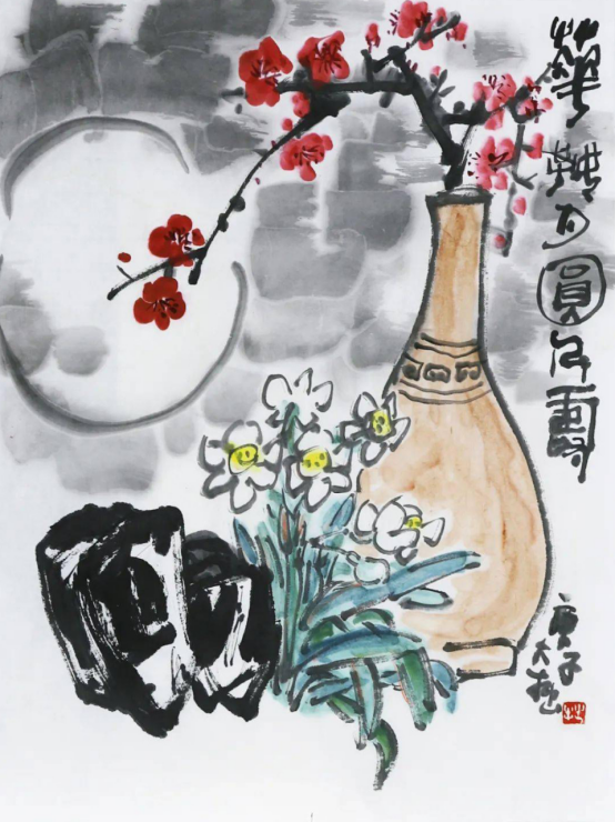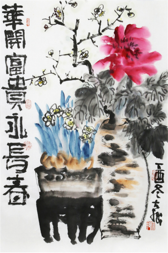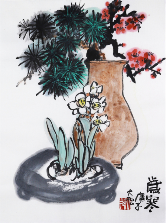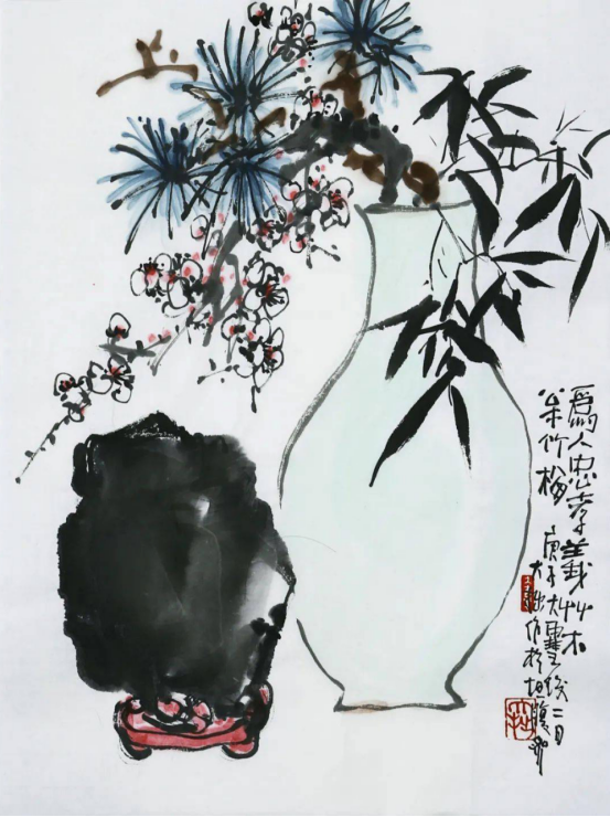 大拙喜欢花鸟画,早期画画受新文人画影响,临摹了很多新文人画作品,我和大拙初识时,去他家里,第一眼见到新文人画代表画家作品挂在墙上,很吃惊大拙有他的作品,当我认真的欣赏后,大拙笑嘻嘻地说是他临摹,以假乱真,让我想起当年的张大千,也是临摹高手。大拙以自娱自乐自我安慰方式画他想的画,很少展示出来。从我第一次见到他的画开始,中间有很长时间没有见过他的画。