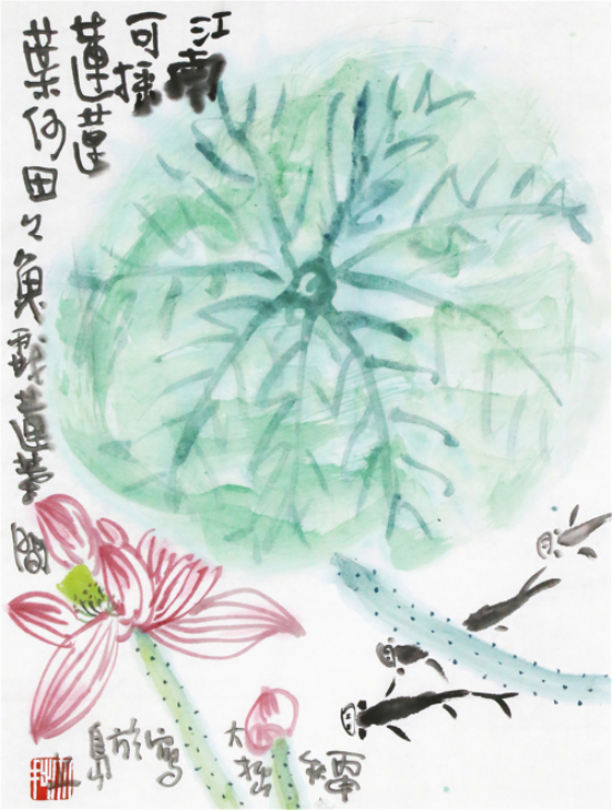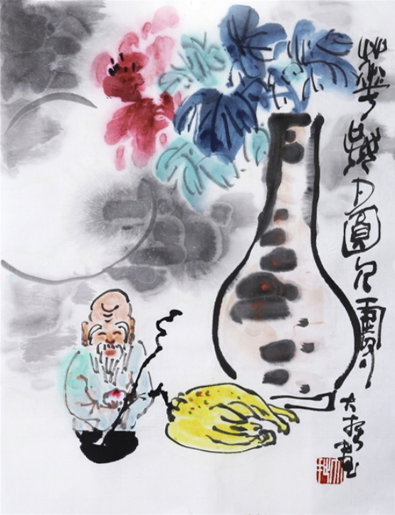 早在南北朝时期,美术理论家谢赫就提出绘画理论中的“六法”论,所谓:气韵生动、骨法用笔、应物象形、随类赋彩、经营位置、传移摹写。这六点在当今中国画创作中仍被奉为圭臬,其中“气韵生动”被放在第一位,后五项都是为它服务的。这是因为在中国人的审美中,生命感最被人们所崇尚。对生命的崇拜和热爱让我们喜爱一个“活”字,这在花鸟画中体现得尤为显著。花花草草、鸟兽虫鱼都成为人们对于生命的盼顾与关照。所以在中国花鸟画当中往往把形象的真实性放在其次,而强调夸张描绘对象的情态,使得它们更加生动传神,整个画面气韵流畅。画面的每一处笔墨都体现出生命感,又要在整个画面环境中和谐相处。这一点是深具哲学意义的,也是中国文化的精粹所在。在大拙的画中,我们看到了这种生动与和谐。看似很随意的几笔,往往能展现出花卉鱼鸟的精神品格。他画的鸟和鱼有的憨拙,有的倔强,有的懒散,有的困顿,但气息都不俗,又都和整个画面融为一体,配合稚拙潇洒的题字,更是相得益彰。
