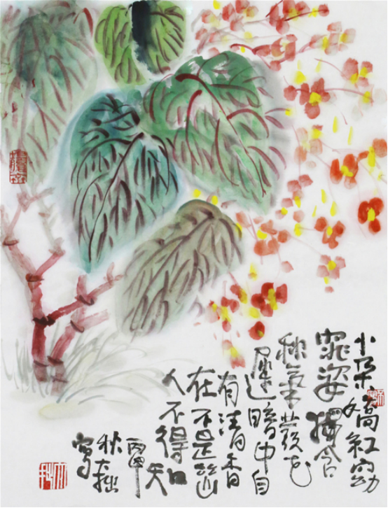 中国画发展到了今天,和古代对于绘画的认识和理解已经有了很大的不同,这不仅是材料上的变化,还是精神层面上的变化。这些在大拙的花鸟里也有了新的体现,虽然是古人常画的题材,但他在构图上、色彩上,抑或是题字上有了新的变化和样式,当然体现出的精神也是一个现代文化人的所思所想,他的这种面貌也不同于“新文人画”近似于调侃的风格,更像是一种生活在新时代的人对古代农耕文化的回想和留恋。 张大拙先生无疑是一位智者,他用深厚的文化积淀描绘出美好的画面,并得到了人们的共鸣。我们虽然生活在高楼大厦的钢铁丛林中,却留恋着乡间农舍的瓜秧农舍、闲花野鸟。这是一种文化情怀,需要抒发灵性,发散思想,在人群之中找到共鸣。