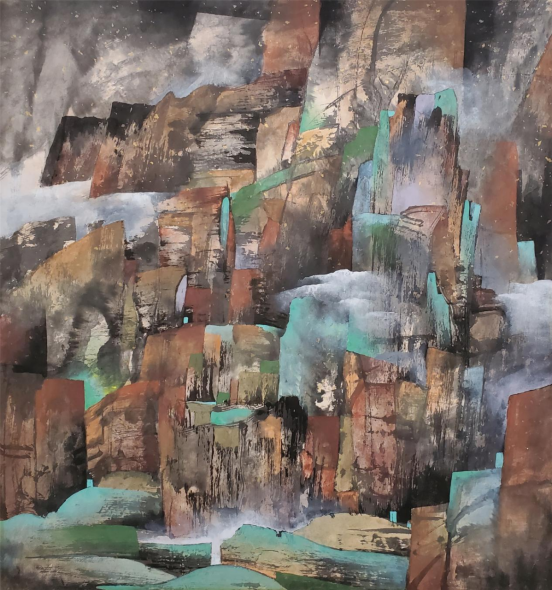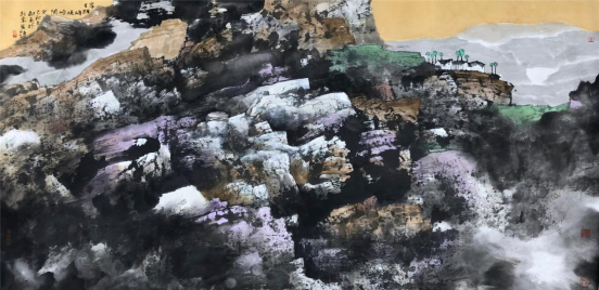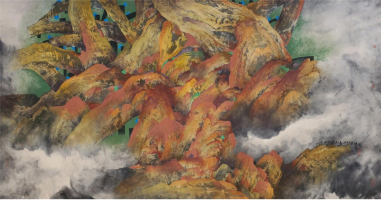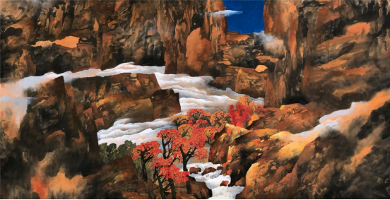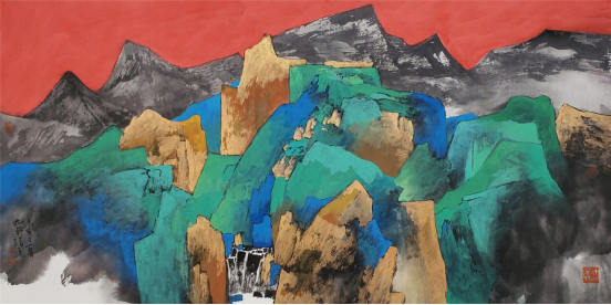 无论是具象或者抽象艺术,其内涵一定是发自艺术家本体的原发形态构思,内心的体验和来源于生活高于生活并以自由释放为目的,久而久之形成自己的艺术风格。武剑飞的写意重彩艺术就是以“表现主义”一种面对自然,面对生活的博大胸怀,发现与展现中华大美河山的精神气概,表现雄浑壮丽,以线面结合,色墨结合的绘画截体布局为祖国山河立传。