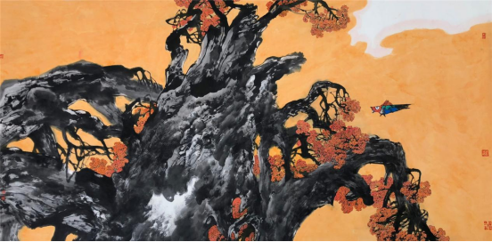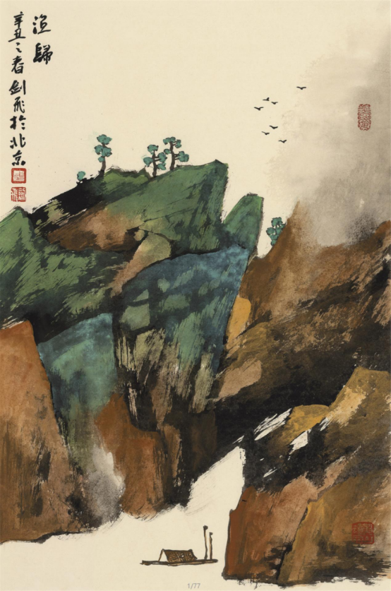 武剑飞对传统绘画形式的不舍,并不是我们说教的继承传统绘画为目的,而是以传统笔墨把当代人的绘画思维,不固守成法,表现新题材,有机融合产生独特的个人绘画图式。武剑飞的大型重彩山水作品更是受到大型楼堂馆所的广泛应用,对大型重彩山水画的创作驾驭能力,打造气势磅礴场景,整体色彩的布局堪称一绝。他长期致力于研究“写意重彩课题”,并根据不同环境的需要,创作不同视觉美感的重彩艺术作品。