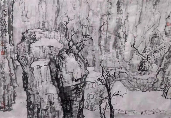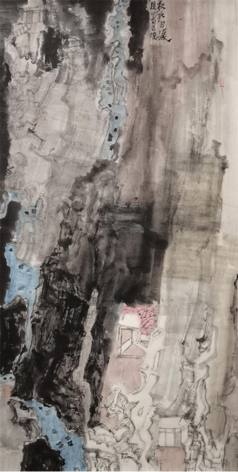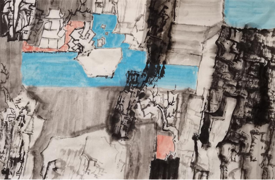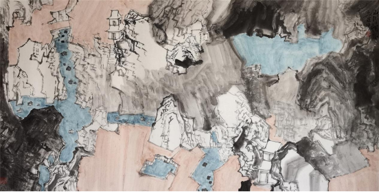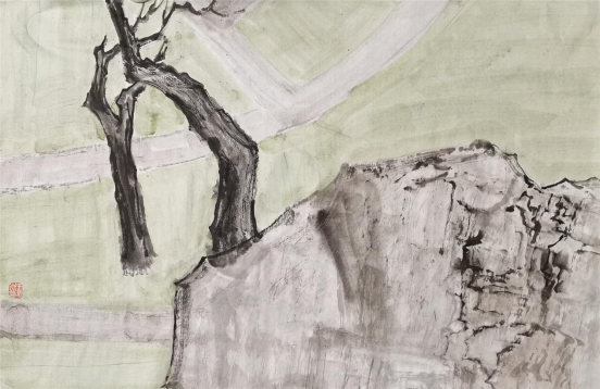 少川的山水画呈现出两种不同的面貌。一种是以简单的树、石、房屋作为画面要素进行组合,画面单纯、朴素,以如何处理物象之间的关系来构思有意义的画面。另一种风格相对复杂,虽然画面要素仍是简单的树、石、房屋,但是在构图上打破了时空及物象之间的正常秩序,物象之间相互穿插、相互生发,给人以荒诞、离奇的错觉。这类作品如“山川相繆”“山河任我重安排”系列,其创作灵感源于中国古代佛寺壁画及西方现代派艺术。无论哪种风格,与传统山水画的构图形式都有明显的不同。传统山水画构图强调山有龙脉,水有源流,路有来处,要做到可居可游。南朝画家宗炳把山水画的功能归为“老病俱至,名山恐难遍游,惟当澄怀观道,卧以游之”。一千多年以来“可居可游,澄怀观道”成为山水画的重要功用和审美法则。少川的山水画,摆脱了这种功用目的,将山水画还原为纯粹的审美形式,从而摆脱了传统山水画构图的束缚,形成了具有现代审美趣味的山水画作品。