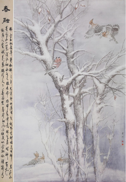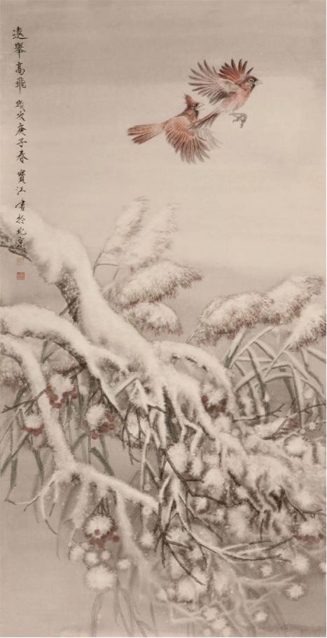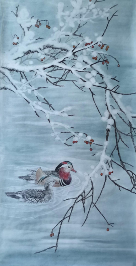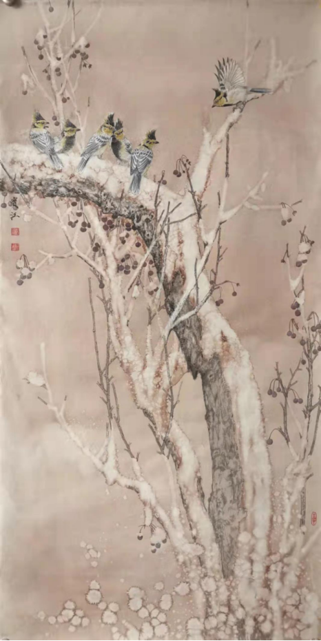 程宝江先生立足传统,锐意创新,工笔画细腻唯美,生动传神。他的吉祥羊系列作品,以细腻的笔触,精工线描,层层渲染,以富有时尚感的刘海造型,创新三羊开泰,祥瑞和谐的新时代画风。 他的花鸟系列作品,善于以冰雪做背景,来体现鸟雀的生动与活力,在色彩的对比中,冰清玉洁之中幻化出粲然夺目的鸟之魂,体现书画家高洁,孤傲的内心世界。 ——《中国书画家报》副主编孙秀明