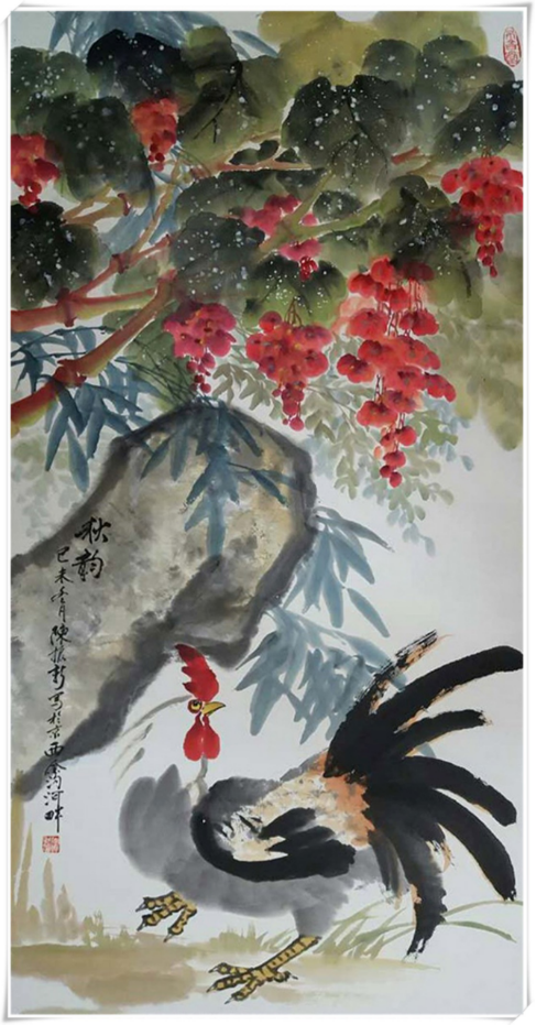 振新先生已年逾七旬,仍旧每日笔耕不息,新境新意层出不穷。振新先生穷毕生心血,存齐派精髓于笔墨,一情一怀均赋予丹青,于齐派艺术,于中国山水花鸟画,于我辈有幸欣赏其大作者,功莫大焉,善莫大焉! 观赏陈振新先生的作品,不由情禁地感悟着一种在自然生机;墨竹挺拔,花儿灿漫,雄鸡高歌,鱼翔浅底;雀儿在天空中展翅,家禽在树荫下寻觅……。其作品以凝练灵动的笔墨,描述出博大精深的内涵,凸现了他对生活深入的观察和对事物本质的深刻的把握。个性鲜明、大胆创新、用笔简洁流畅、章法考究、意蕴深远依永。无论是谋篇造势还是笔墨渲染,都显示出其娴熟的艺术功力,创造性地实现了艺术境界与表达手法、历史人文与现实空间的和谐统一,体现了激情与灵感的自然流露,从多种角度折射出其馨香的品德和高洁的志向,达到了形神相通雅俗共赏、意高趣浓的境界,给人以极大的艺术享受。