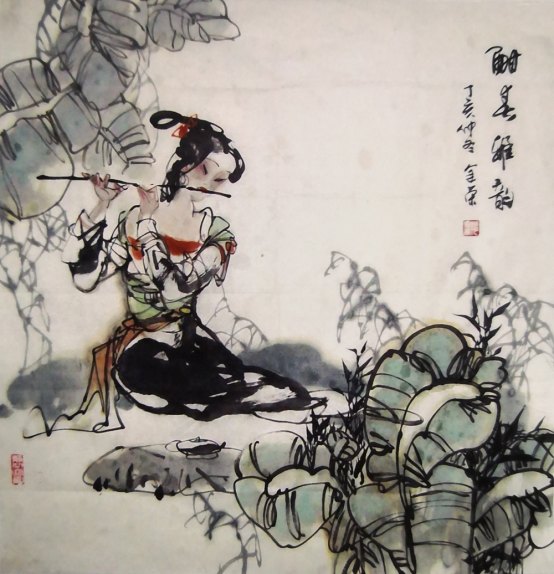 张金荣的水墨人物画大多取法后者,多年来他潜心研究人物画的衣纹样式,一点一画、一拖一摆均在力求凸显线条的美感,为充分发挥书写用笔的特性铺出水墨平台。他塑造人物的线条感强烈,即体现了准确的人体结构和夸张有度的动态,又具备书法艺术的一张一弛节律,合乎章法和浪漫气韵。赏读其画便有轻松自如、清丽俊逸之感。金荣水墨人物画线条呈现出的艺术魅力,主要得益于他早年创作连环画用笔勾线的造型基础和疏密有致的巧思。张金荣水墨人物画用墨用色也很到位。墨色浓淡相宜,既有淡淡的阴柔墨韵,又有浓重的阳刚墨块。