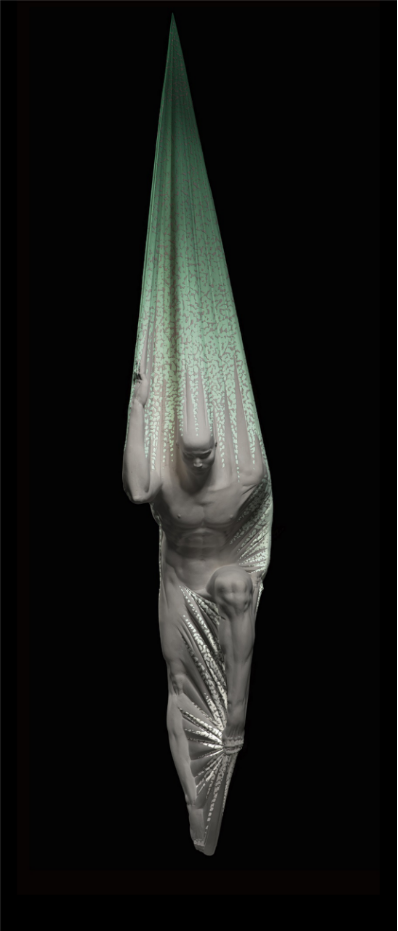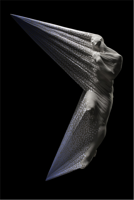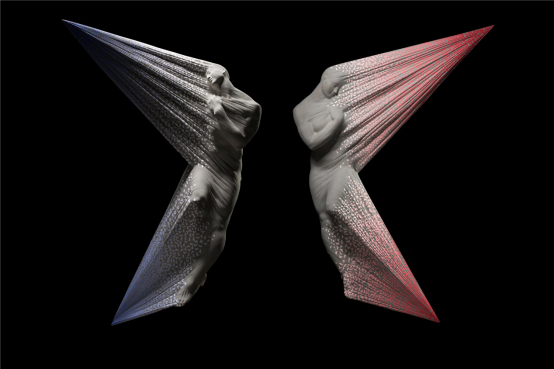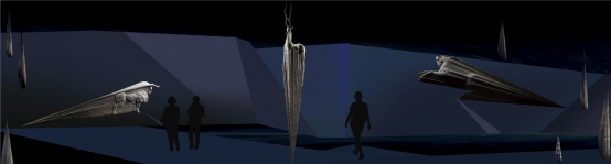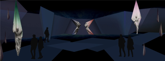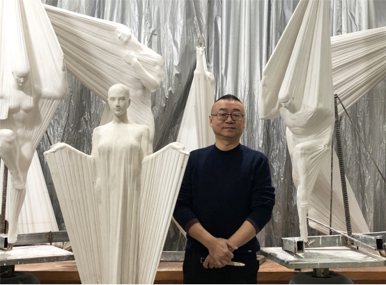 前 言 雕塑作品《融合》系列经过近三年的思考与创作最终得以完成。作品主题关乎于自然与人类,观照的对象是宇宙的物与人之关系。作品中塑造有两类物象:一类是诸如鹿、马、牛、蝶、花、草、树、石等具有自然属性的物,它们腾跃向上或向前,孕育着自然的韵律与节奏,象征着速度、激情与不可抗拒的生长,充满了风驰电掣般的原始爆发力;另一类是由男和女组成的人类,他们奔跑,虎虎生风,即便静止,也被风所包裹、缠绕与拉扯,彰显着力的抗争与较量。 塑造的物象被构置在四个独立的展馆内,意在营造幽蓝邈远的宇宙空间:第一个场景以石的构成为主,无数个飞石从天而降,拖着长长的射线,又弹将回到空中,它们悬浮于空中,极具视觉张力与运动节奏,象征着混沌初开、乾坤空净的宇宙运动。这个场景中所运用带着风的射线造型语言奠定了全场四个场景物象造型的基础,为其他场景中的物象造型都从石的造型演化出来,而且贯连在每一个场景之中。第二个场景分布着鹿、牛、马等形象,奔突升腾,昭示自然预示花草鸟兽,繁衍不止,生生不息;第三个场景和第四个场景由四组人物构成:一组是位于中央的构成蝴蝶造型的男女形象,另一组是分列蝴蝶两侧的腾跃而起的男女形象;一组是向前跨越奔跑的男人,另一组是从落叶中慢慢裸露的女人,这四组形象象征着顺遂时序,生长收藏,永不衰竭。自然界中的天、地、人和合而生,正如《易经》所谓:“天之道在于始万物”“地之道在于生万物”“人之道在于成万物”。 《融合》作品力图发掘所塑造物象的“物性”,同时,试图营造天地人相生相合、物我两化之意蕴,表达对于传统文化精神的艺术情思,寄寓心灵自由、超然物外、妙造自然的精神境界。