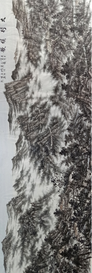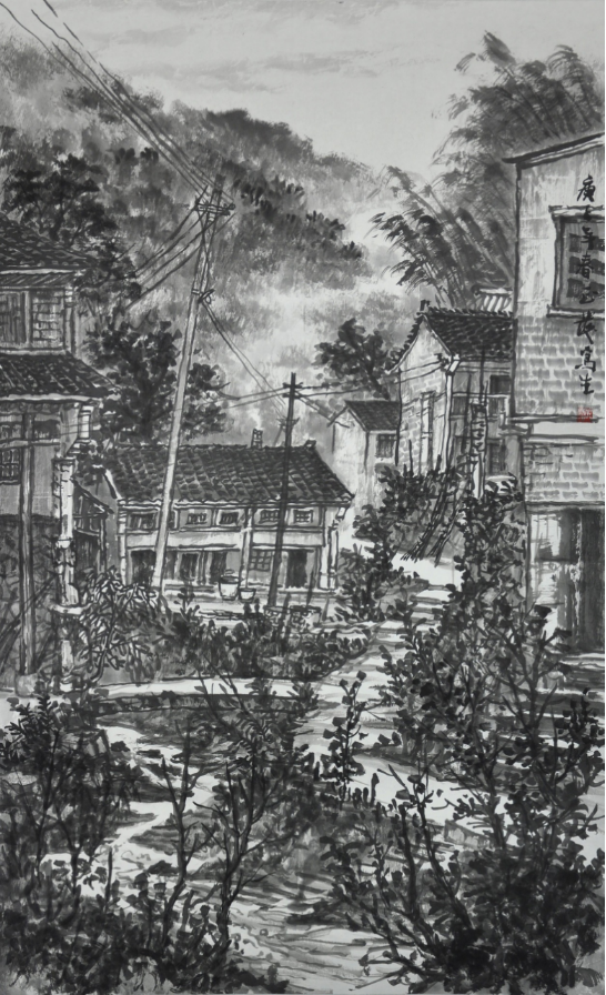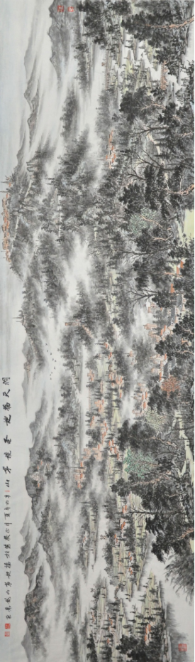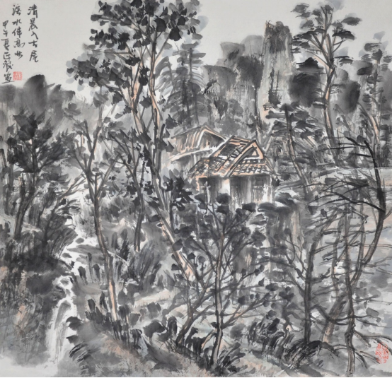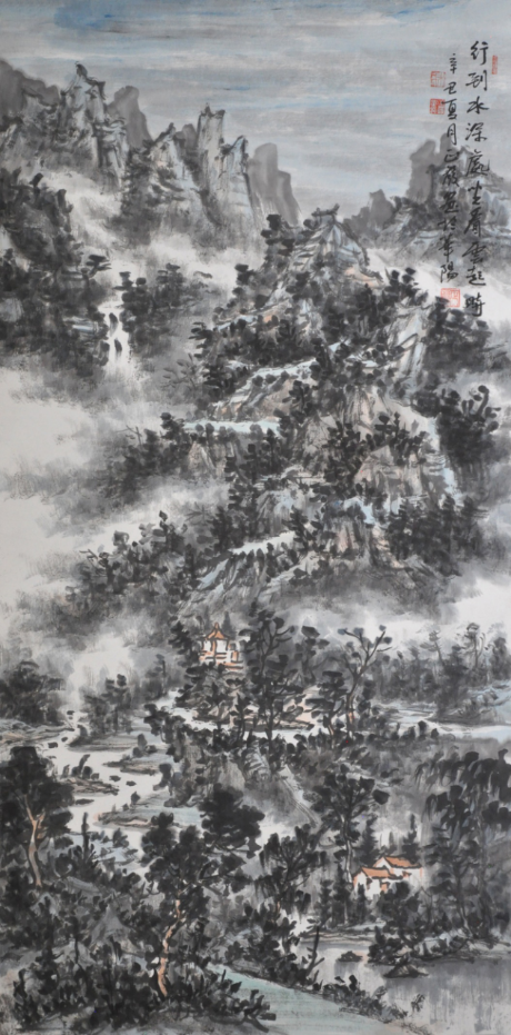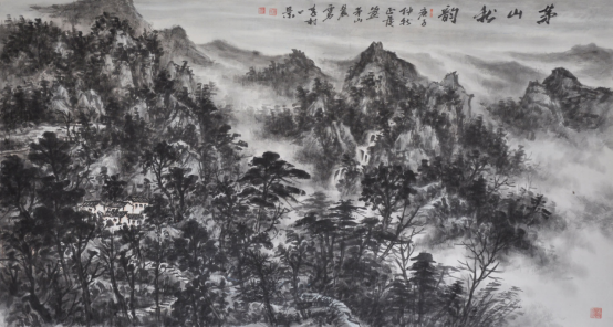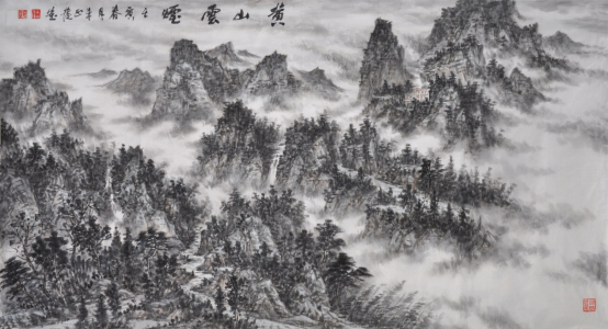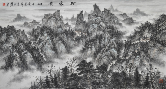 成功之山水画家,必然多以家山为创作对象,这显然是一个相对主义的论断。山水画家内心藏千山万水,无论是视觉经验的世界山水,还是超验的灵感世界山水,一起皆统摄于他的笔端。纵观朱正发先生多年的山水画创作,无不验证这一亘古不灭之艺道宏规。余观乎其家山写生墨稿,笔墨之精妙,取景之匠心独运,无不让人惊叹。石涛云:“笔非生活不神,墨非蒙养不灵。”画家朱正发先生亦与生活蒙养而有所悟也,若不臻于此境,其笔锋下何以决出生活,画幅中何以寄予性灵。他的《句容胜景图》、《茅山颂》、《秀色江南》、《烟雨瓦屋山》、《赤山印象》等家山系列之作品,更是以神思与禅悟,以及生活与蒙养之情境来创作的。除此之外,他还有许多以祖国大江南北的山水与古迹名胜,乃至古诗为其师造化。如《太行人家》、《万年浦江》、《层林尽染》等作品。
