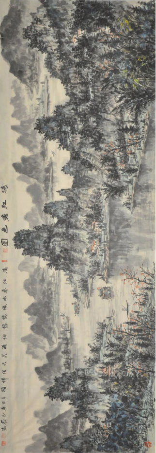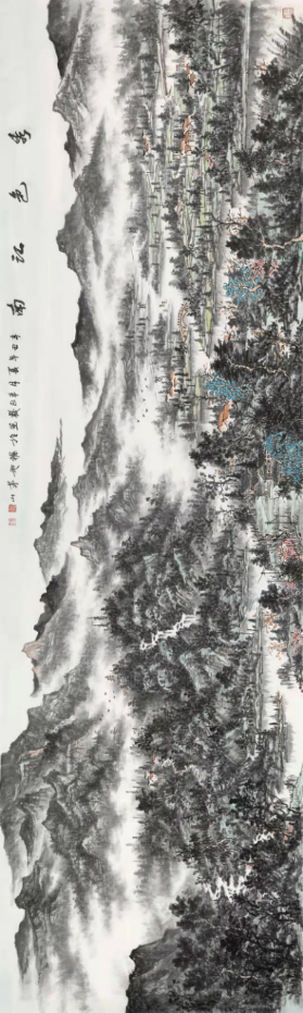 朱正发先生的山水画之整体风格以雄浑为主,雄浑者何?司空表圣云:“大用外腓,真体内充。反虚入浑,积健为雄。具备万物,横绝太空。荒荒油云,寥寥长风。超以象外,得其环中。持之匪强,来之无穷。”这是诗品,亦是画品。鉴赏朱正发的山水画,从作品之内容来说,可谓“具备万物,横绝太空”。如他的《句容胜景图》以百米之广,浓笔重彩表现家乡山水之美。从画面具体之物象描绘的视角而言,则又以书法用笔入画,此又暗合“骨法用笔是也”。再近观其质,用笔松动,墨韵天成,其千笔万笔,积健为雄。有趣的是每个物象之间又是虚实有致,一直保持其“反虚入浑”之境地也。如若再整体观其画,则山水之势,如天崩地坼,又若壮士凯旋而归,其气霄云汉者焉!朱正发先生之山水画大幅气势如此浩翰壮阔,小画亦然。寸纸尺牍之间,尽显画家正大之气象,但凡如此,方可真谓“荒荒油云,寥寥长风。”