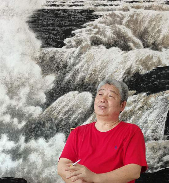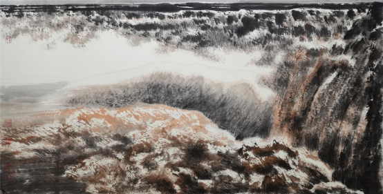神灵气行,情致自生,连绵相传,势脉贯通,气韵自然生动。高杰的《黄河之水天上来》、《碧海惊涛》画的都是水势。整个画面,瀑布飞溅波澜汹涌,飞扬升腾气势雄伟。高杰正是用虚中含实,实中有虚,阴阳相济的中华传统辩证理念,以缥缈混沌的皴法,画出了瀑布的汹涌澎湃和万马奔腾的雄浑之势。把中国画技法的虚与实,气与韵处理得恰到好处,如无画水则情溢于水的真性情,是很难达到神往无穷之艺术境界的。