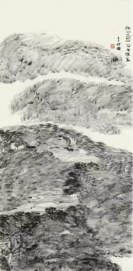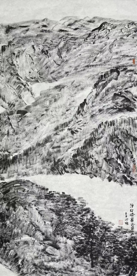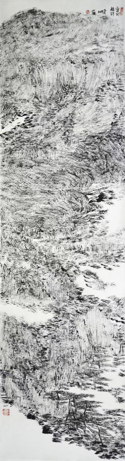 王祥夫:你的焦墨山水是一个新的点,从张仃先生的焦墨写生到你的焦墨山水创作,从客观临写到主观情感的抒发。我觉得这之间像是发生了一件什么事。我们现在不怎么提倡“笔墨当随时代”或者是“用笔墨反映和讴歌时代”这样的话语,但有一点十分重要的是你的焦墨山水明显让我感觉到像是一列火车脱离了轨道,突然开向了自己的原野,我特别喜欢你的焦墨山水也就在这一点上,是心性所为,也是你的热情所在。看了你的焦墨山水我都甚至在想我是不是停顿下来,朝另一个方向推进,但我毫无目标。你从什么时候开始建立了你在这个空间中新的可塑的功能?