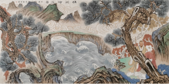 我们不妨欣赏下王伟宾的道释人物画。先看其用笔用线,他以游丝描、铁线描、莼菜描等描法塑造人物,信手拈来,纤毫毕现,准确生动,纯熟自然,显示出深厚的传统功底;若深入去看,由“笔势”转化为“线势”进而形成一种“画势”,势不可挡,扑面而来,使人观之,犹闻其声,可察其动。再看其用色,在传统赋色基础上,他依据不同的道释人物与绘画主题,采用不同的设色方法,或重彩或淡彩,或勾染或晕染,使色彩更加丰富,灵活多变。由此,他将对道释人物性格表现寓于环境、气氛、姿态、线条以及墨与色的渲染之中,已达形神兼备。