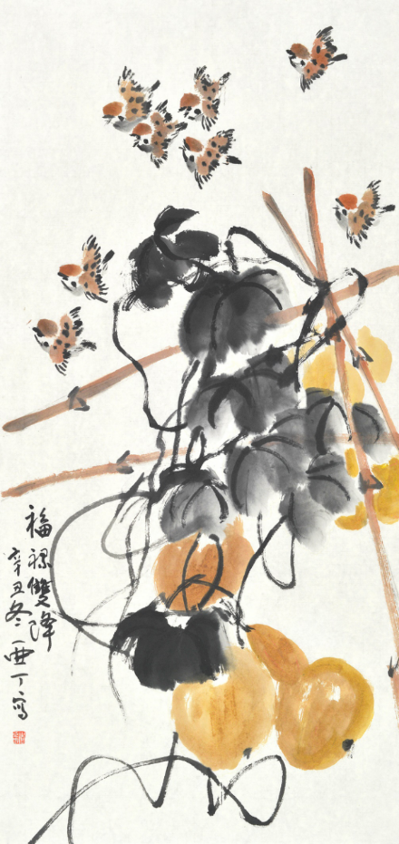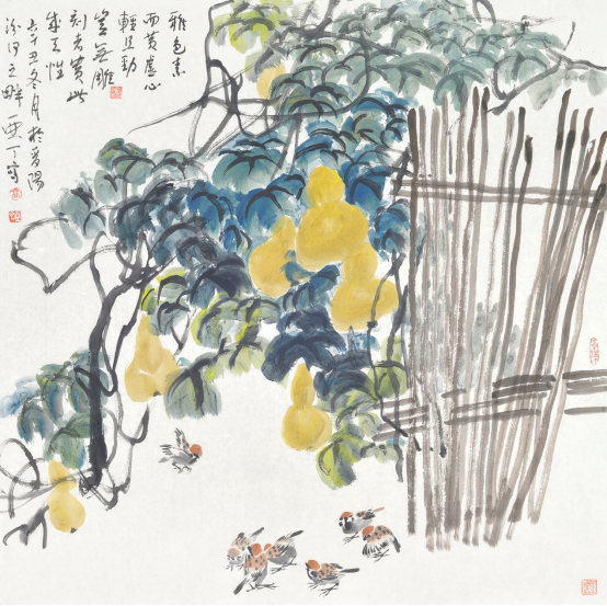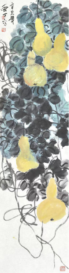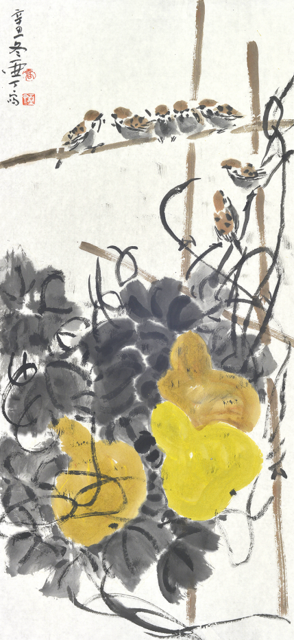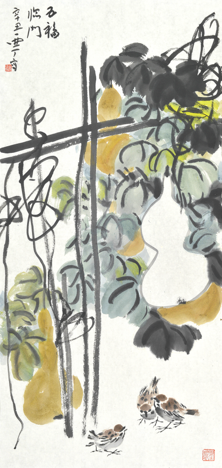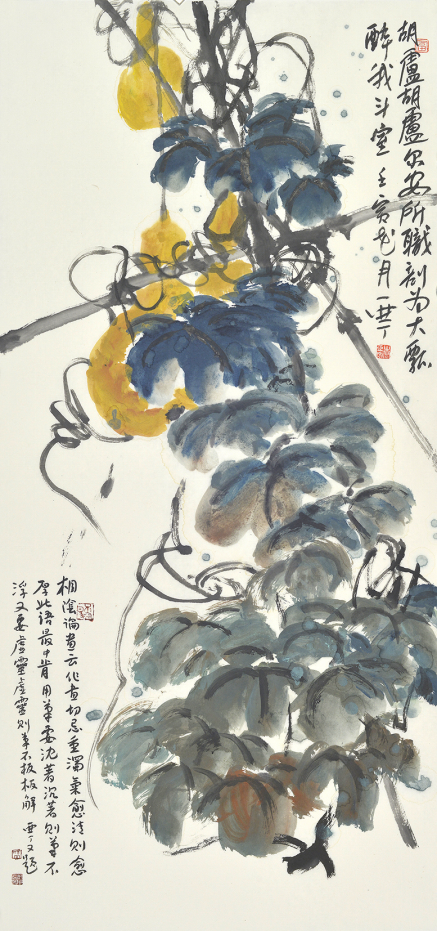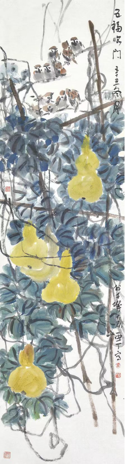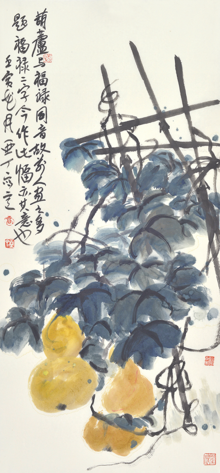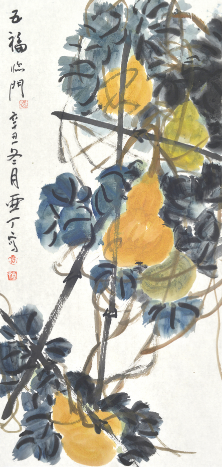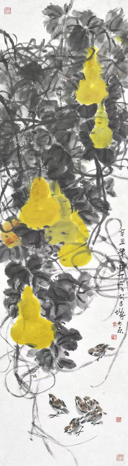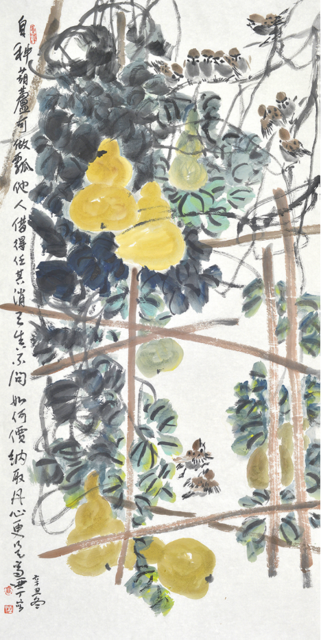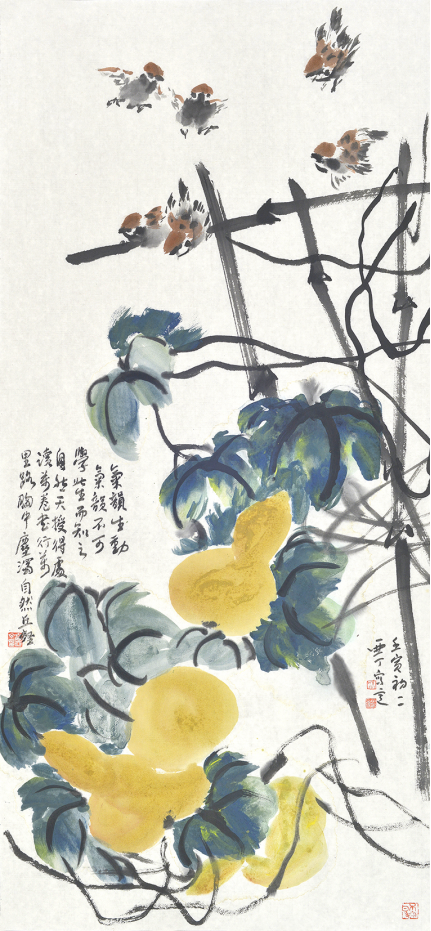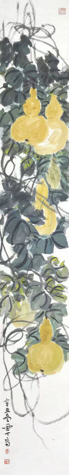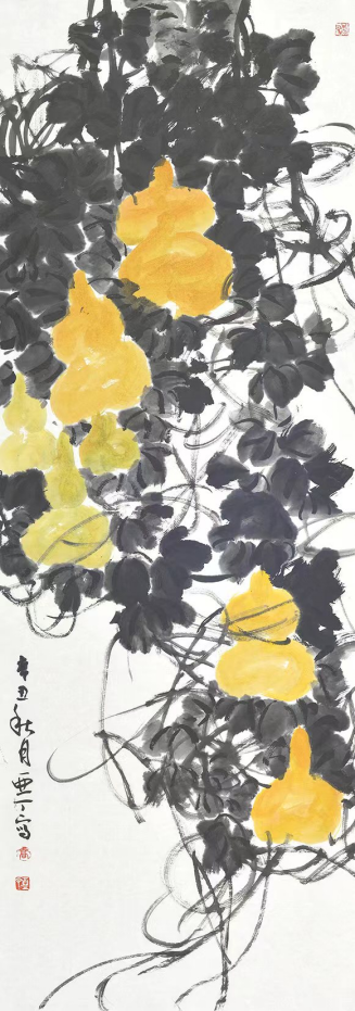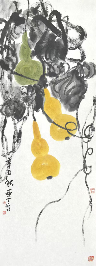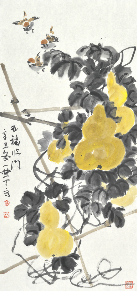 乔亚丁先生长期深耕于中国花鸟画创作,在守正创新中执着追求、大胆探索,在师承前人的基础上重视写生、师古而不泥古,尤其注重中国画传统与创新的有机结合,使其花鸟画从形式到笔墨都有独到之处,形成了自己独特的艺术特点。 正因此,我们深为乔亚丁先生在绘画艺术上表现出的才情学识、取得的艺术成就所折服,遂向乔亚丁先生约稿,同时也是以此表达由衷的敬仰和钦佩。《葫芦》专题画一组,供书画界同仁和花鸟画爱好者欣赏。 葫芦与“福禄”谐音,取“福禄双全”的吉祥寓意,同时有积财聚财、多子多福的内涵用意,象征着家族人丁兴旺,子孙延绵。可以说,葫芦自古以来便是人们心目中增寿、降瑞、保福的吉祥物,代表了中华优秀传统文化的精髓和特质。 观乔亚丁先生这一组《葫芦》专题画,每一件作品都满溢着生活情趣,浓艳的柠檬黄和厚重的墨色叶形成强烈反差,色墨淋漓,光彩灿烂,画面气氛十分热烈,不论构图、画意还是行笔、着色,皆韵味绵长、传神高妙,无不给人以极大的艺术享受,不禁让人由衷感受到“因喜葫芦能解笑”。