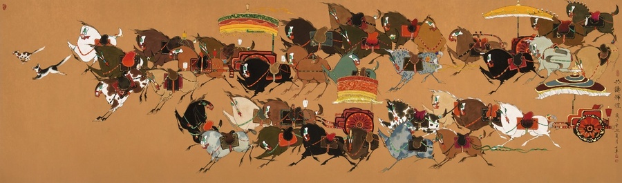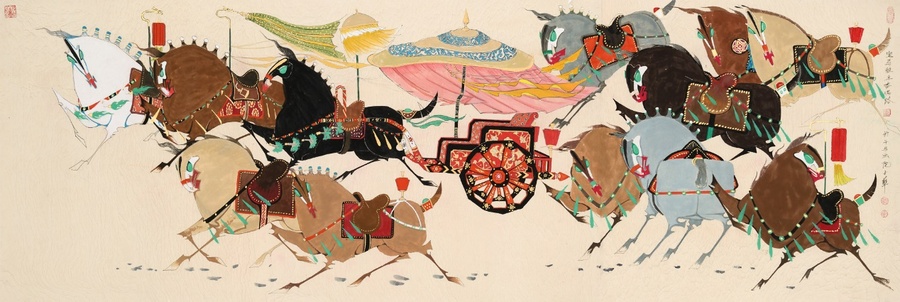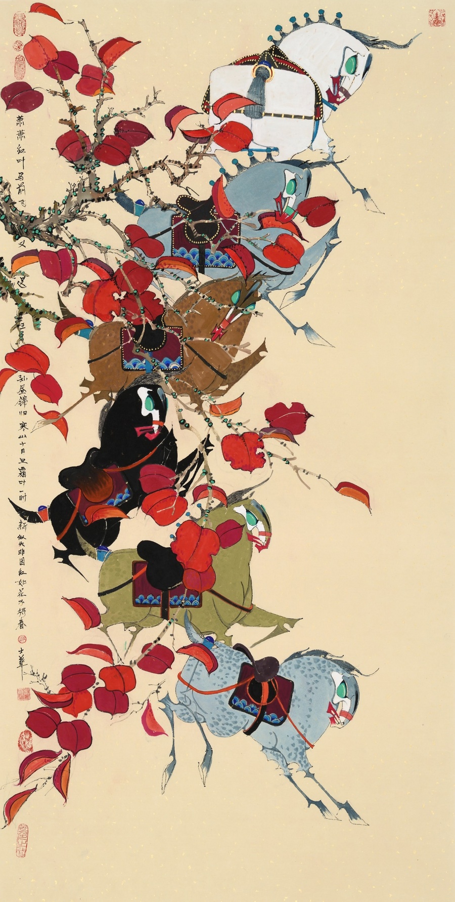 邹老师笔下的马: 自徐悲鸿大师后画马的画家层出不穷。然,邹老师笔下的马以其独特风格在当代画界可以说独树一帜傲视群雄。 他笔下的马铁骨铮铮汉风唐韵,宽阔的胸大肌圆润的美臀汉马唐风一览无余,古战场上或柔情似水极尽羞涩,或春风十里呼啸、或月下饮酒抚琴、或花下柔情低语。邹老师特别注重线条的坚挺力度和结构的细节处理,凸出重彩画家的重彩的效果(个人观点)。他独特的画马风格,我知道前无古人,是否后有来者?格格不敢断言,或许有一天格格也可尝试着画几笔?然,当下的水平无从下手…