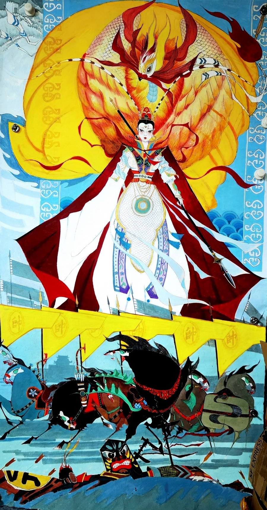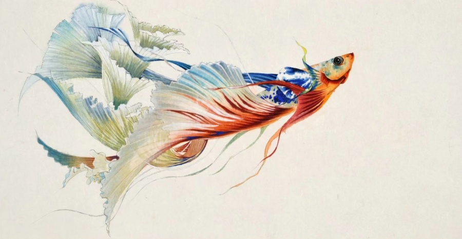 邹老师笔下的鱼:自喻为龙鳞飞天潜龙出水或一跃而起,或迎风破浪,或裙裾摇摆如西施浣纱,或寻觅或回眸如青衣甩袖,在大海与天空之间翩翩起舞似潜龙出海。让人不禁感叹:这世间真有龙女在世?真有美人鱼在追求世间的王子!我也曾和老师探讨过,是否把他笔下的鱼上半身改为女人…