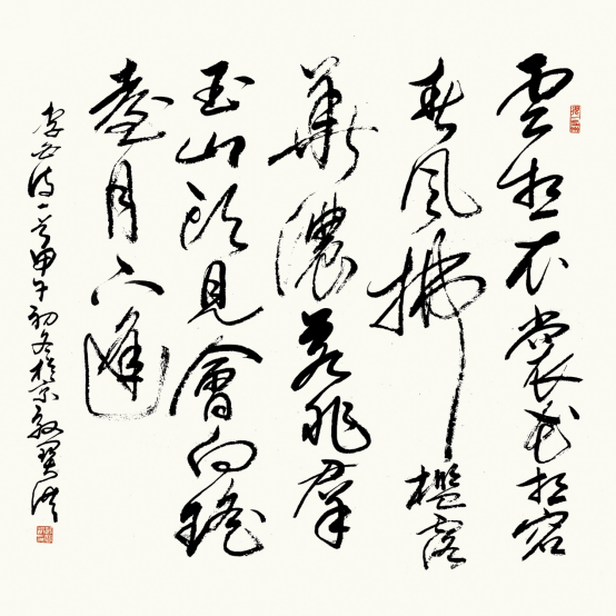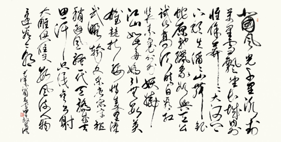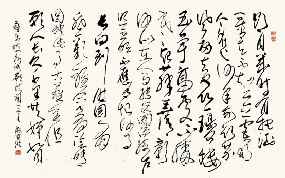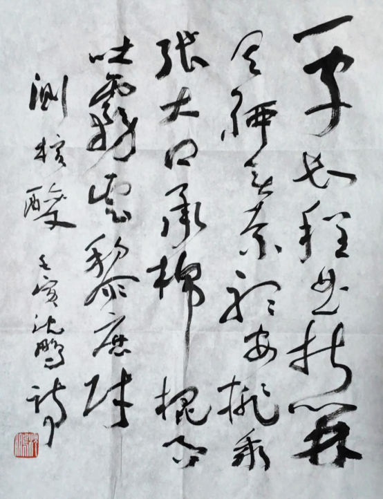 草书 《测核酸》 沈鹏 释文 一字长程曲折开, 有聊无奈听安排。 乖张大口捅棉棍, 吞吐雾云黎庶财。 2022年7月