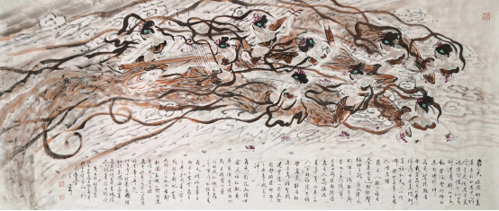《山东人》:在您看来,中国画最重要的元素是什么,您的作品是怎样匠心独运逐渐形成独特风格的? 王心安:中国水墨写意的元素,从技能方面讲,笔墨是最重要的。水墨画中,首先讲究用笔,用笔的功力决定线性的质量,线条是画之骨,线条优劣决定画面质量。其次是用墨,用墨之道在于用水,以水化墨,方显气韵生动,浑厚华滋。 在中国画创作中,技法是浅层次的,而意识是最重要的。就是在创作中要有想法,要创造自己的笔墨语言、构成形式、色彩倾向、文化内涵。