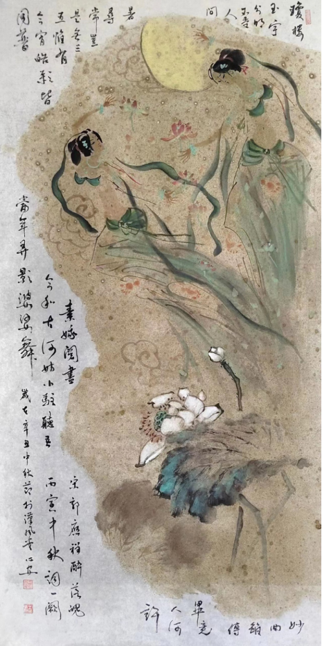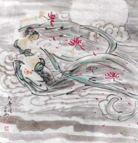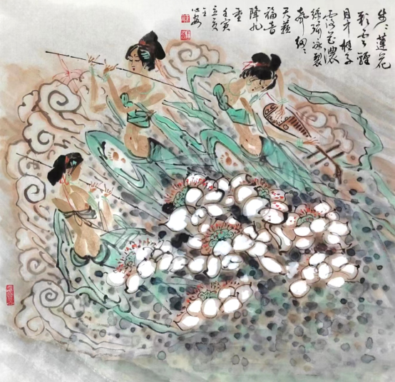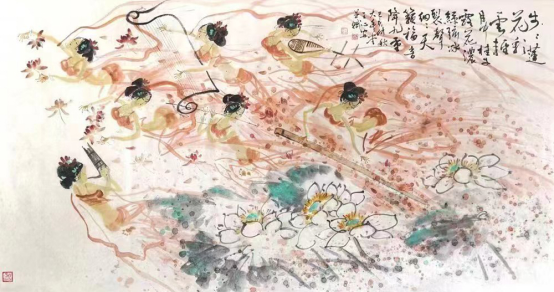 《山东人》:《飞天》系列作品表现的是怎样的审美趣味和宗教情怀? 王心安:《飞天》作品具有中国传统的审美意味,她具有浪漫主义色彩,是人们的美好向往,是丝绸之路上的飞跃天堑之梦想,是中国人一直以来的中国飞天梦。飞天是人格化了的神,是神格化了的人。其次,飞天具有唯美主义倾向,表现人类自身的完美,并突破人的局限性,把现实生活诗意化,将人间塑造成天国家园。再者,以飞天人物为载体,表现国画本身的笔墨趣味,相得益彰。 宗教画是东西方绘画的主要题材之一。《飞天》属于宗教画的一部分。希腊女神是维纳斯,飞天则是中国的美神。飞天是佛教中的飞神,主要司职向人间降福降寿,散幸福花,传吉祥乐,是和谐、美好、幸福的象征。