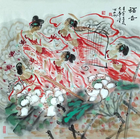 前期,我专画《孔子系列》,有工笔、写意,还有大型壁画雕塑。国画曾在中国美术馆展出,分别获一、二等奖。创作的国画《孔子像》,被中国孔子基金会评为孔子标准像,并收藏。壁画上墙近万平方米,雕塑五十多组在全国各地落成。 我研究创作《飞天系列》三十多年了,对莫高窟壁画、印度佛教雕塑、舞蹈、唐代仕女画等,我都做了深入的研究和摹写。在我的《飞天》画里,是用我自己的水墨写意的崭新笔墨语言,诠释着我的哲学思考。