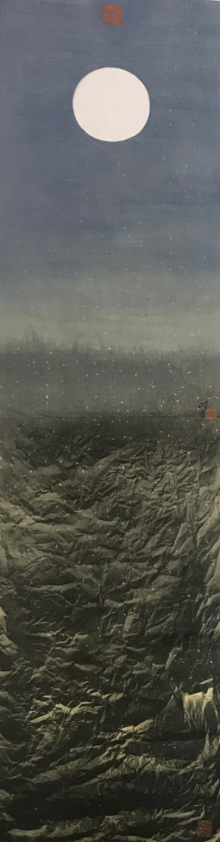 问:画与画的关联以及不同之处 答:我在2013年之前的创作以版画为主,作品偏重于关注当代社会人的生存环境,个人理想与社会现实的矛盾冲突。2013年开始转向水墨,开始也是延续版画创作中的一些思考,比如《乡关系列》作品,以横幅长构图表现我所感受到由于过度开发带来的自然环境的改变,表达是一种当代的精神乡愁。2014年我创作了《山水》系列水墨作品,表现的是被人类过度干预和破坏后的碎片化的山水,完全迥异于传统山水画的审美意趣。因为在我看来,传统山水画中的诗情画意在今天已荡然无存。2015年以后的创作则重新在作品中寻找诗意,表现是心中的理想化与人格化的山水,追求一种荒寒、沉寂、自在无人的山水,更符合自己的美学理想。