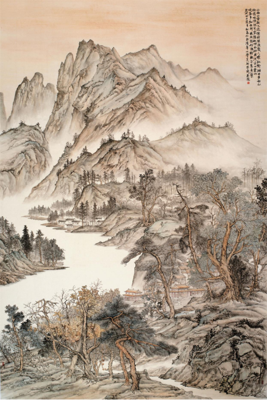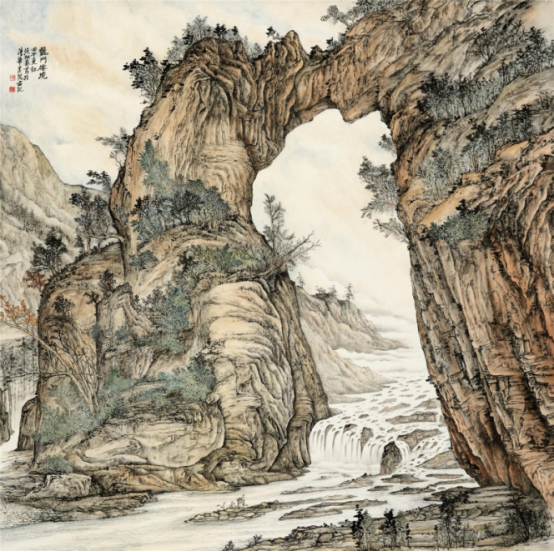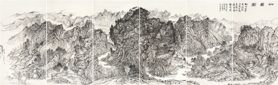 如果说表现新民、新村、新时代的山水是范松森向“笔墨当随时代”的致敬,是立时代之潮头、发时代之先声,而代表了一个时代的风貌,那么,他还画了《龙门仙境》《太行雄风》《张家界揽胜图》《太行山居图》《山清水秀》《红千晓景图》《山雨山云图》《山水清音图》等等一大批以笔墨至上、以气势雄浑取胜的大山、大水、大世界。这些作品则是笼天地之精华“以形媚道”的“畅神”表达,代表着范松森山水画的艺术高度。