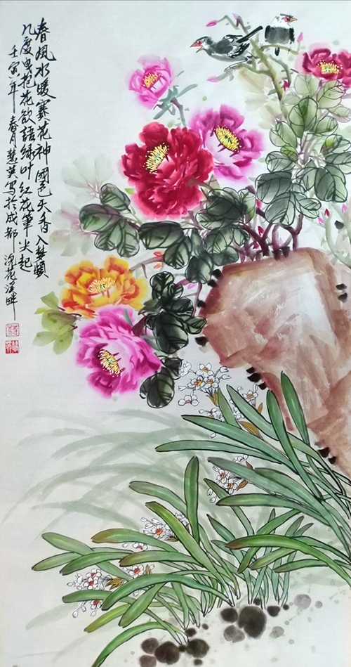 1997年,作品《鸟语花香》在北京展出,同年花鸟画在新加坡展出获银奖,并被聘为高级艺术顾问; 1998年,作品《金江两岸花盛开》在中国美术馆展出,同年参加新加坡神州艺术院主办的展览作品《啸震千山》获得特等奖; 1999年,作品《香溢九州》参加全国“国花杯”书画大赛获金奖。作品《富贵平安》入选北京中国邮政发行的跨世纪书画名家精品系列明信片,已全国发行。后来“鸟语花香”入选全国贺卡的发行; 2001年,作品《国色牡丹含苞放》参加中国近现代书画家作品展,在北京中国历史博物馆展出,并入选画册; ![]() 2002年,作品《一阵春风过江来》参加著名画家年展在台湾阿里山展出获一等奖; 2003年,作品《紫气东来》参加四川省美协画展获二等奖。 2004年,作品“唯有牡丹真国色,花开时节动京城”入选中国邮政发行的明信片。 2005年,作品“大地同春”刊登在国画家杂志 10 期上; 2007年,作品 4 幅入选华商杂志海外发行; 2008年 12 月,有 16 幅花鸟画作品入选中国邮政发行的个性化邮票; ![]() 2014年,出版个人专辑《蒋慧英作品集》。同年,中华艺术名家海外报刊,发表了最具潜力的艺术家,蒋慧英老师5幅花鸟画作品; 2015年,作品被《笔尖上的中国艺坛领袖》画册收录; 2018年10月,参加“大匠之心—全国书画名家作品展”,作品并入选《大匠之心—全国书画名家邀请展作品集》。作品多次被陈列馆收藏; 2019年作品入编《艺术为人民》作品集。 当代书画名家精品集《新时代新征程》; 2020年被北京京华阁书画院聘为常务理事,参加全国网展《大家风范》,出版个人画册,中国艺术家。由天津美术出版社出版的台历,蒋慧英老师六幅花鸟画入选台历。 ![]() 2021年,参加中央台二十一届大采风年度盛会获德艺双馨艺术家称号,并参加现场作画。中央台朝闻天下报道了蒋慧英老师,十七幅,花鸟画作品。蒋慧英移动画册。刊登了七十幅作品。出版了个人台历入编作品23幅。作品四幅入选中央台出版的台历。有两幅参加文化中国主题巡展。作品七幅入选《消费艺术与指南》。 ![]() 2022年,作品入选《中国近现代美术年鉴》。 2022年,作品58幅花鸟画参加了中央台制作的,非物质文化遗产蒋慧英数字博物馆。 作品《田园春光》在北京地铁全线展览。作品在中华英才网发布26幅。 ![]() 看蒋慧英女士的绘画作品,从虾趣图看到珠玑葡萄,从一池馨荷看到富贵当头,都有一种气韵生动的艺术魅力,画面质感特别干净,极是不落纤尘,一丝不苟的精湛。这难怪那么多的人喜欢看她的画,因为此种纤尘不染的画风,最能让人明心见性! ![]() 在当代画坛,中国画的画法有点儿乱糟糟的现象,一些人士画画有“乱涂乱抹”的习气,结果画出来的东西粗服乱头,不显雅观,没有赏心悦目的艺术属性。现在你去看蒋慧英女士的所有作品,都相当注意用心营造唯美的气氛,落笔定位准确,笔笔相生,笔笔到位,比如《花团锦簇满山川》这样的作品,既是执笔在手,运笔在心,心有竹成的塑造过程,所以画质天然,随心应手。 ![]() 还有《秋风拂过海棠红》这里面既没有涂得乱,也没有抹的浊,干干净净画天朗,清水濯洗绘气清,秋风秋韵,扑面盈心,如读过的一首唐诗,如诵过的一首宋词,越看越有滋味,极其耐读。作为一名女画家,蒋慧英女士为当代画坛奉献了非常令人陶醉的丹青佳作,让人在惠风和畅的气氛里游目骋怀,足以极视听之娱! ![]() 蒋慧英女士画画,画得这么臻美,如此干净,究其原因是与“专业”大有关系的。国画之法经过数千年的传承沉淀,形成了严谨的法度体系,必须像蒋慧英女士这样把传统画法作出精研覃思,才可以执笔作线条,让勾勒无有一笔糜软无力,无有一根线条成为散兵游勇!笔法精湛,善作骨风,比如画成的《孤芳不肯竞春艳》这件兰花作品,真可谓是骨法用笔,应物象形的典范!把兰花塑造得刚柔相济,清芬解秽,非常有精气神。在雅舍挂这样的一件作品,必定盈满文化气象,是谓雅俗共赏的上上品! ![]() 精湛的画法,除了有自我修炼的原因之外,还有法由师授的机缘。蒋慧英女士曾经师从王西林、马小松诸先生,得到口传手授,更好地觉悟了画道。又私娴齐白石画法,追求妙在似与不似之间的玄机要妙,不因似而俗,不因不俗而欺世,带着兼工能写的炉火纯青作花鸟,可再夺物象之精神,可以掠物象之体貌,所画牡丹最具独家特色!娇而不艳,枝味铺陈得相当天质自然,以求空间灵动大气,花头艳而不俗,不着丝毫烟火气,全是臻域仙子来! ![]() 纤尘不染绘丹青,万类之像显形神。她把牡丹的自然属性与文化内涵完美地统一在一起,看是一幅丹青美图,觉是吉祥富贵意,达成了雅俗共赏,可以装饰万家屏障的艺术魅力。所以她的作品参加展出是金奖之尊,收藏则为琼花玉蕊,是为当代美术的惊艳佳作,可以承载丹青文化春秋相传! ![]() ![]() ![]() ![]() ![]() ![]() ![]() ![]()