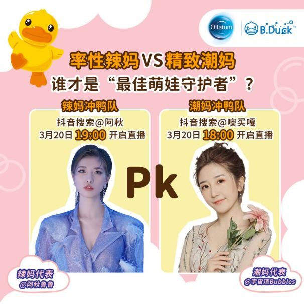 强强联手,助力品牌 3月6日,Oilatum爱丽她X B.Duck小黄鸭联合叶一茜的直播间开启“萌宠套装”限量发售”,给宝宝全方位呵护,一起Get萌娃的宠爱模式。 叶一茜化身女王冲鸭队和淘宝直播观众热情互动,让直播间的观众惊喜不断,把萌宠礼盒带给更多女王奶爸,让各位奶爸奶妈们对宝宝的洗护产品成分有了更全面的认知。叶一茜和田亮夫妇发起了并组成女王冲鸭队和奶爸冲鸭队2支队伍,共同PK争夺“谁是宝宝的超级守护者”活动,希望通过两支队伍不一样的宝宝护理观念,让消费者在获得护理知识的同时,也能感受到Oilatum爱丽她对宝宝们健康的关注度,为奶妈奶爸群体带来全新品牌体验,守护宝宝肌肤健康。