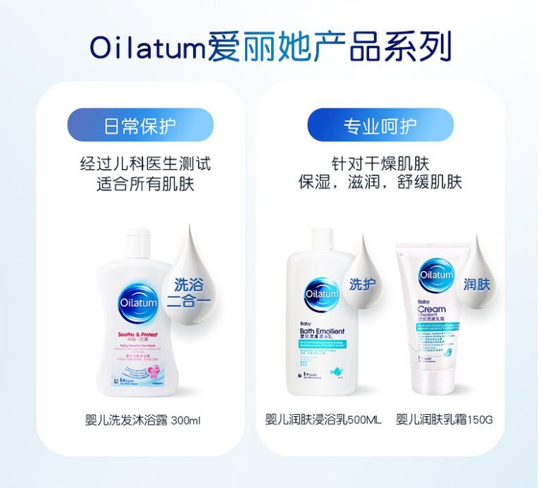 医生推荐,专注宝宝肌肤健康 宝宝们的健康才一直是家长高度重视的,沐浴露的成分尤为关键,专业护肤,贴心守护,安全温和的萌趣好物才能给宝宝加倍的宠爱。婴儿的皮肤角质层比成年人要薄的很多,频繁洗澡会破坏身上的皮脂,使皮肤干燥。此次推出的产品,是英国医生推荐的国民品牌,不仅对宝宝而言,更是一种款全家人都可以使用的沐浴露。为了呵护宝宝的皮肤健康,妈妈们更是化身研究员对每一个配方进行考究,守护宝宝的每一寸肌肤。对于这些要求,Oilatum爱丽她沐浴露专注从保持宝宝健康肌肤角度出发,使用安全温和的配方,全方位呵护宝宝肌肤,专注解决宝宝皮肤干燥湿疹等问题,独有的OH3成分更注重滋润、补水,帮助肌肤长时间储存水分滋养肌肤,这样的沐浴露你还不放心给宝宝用吗?