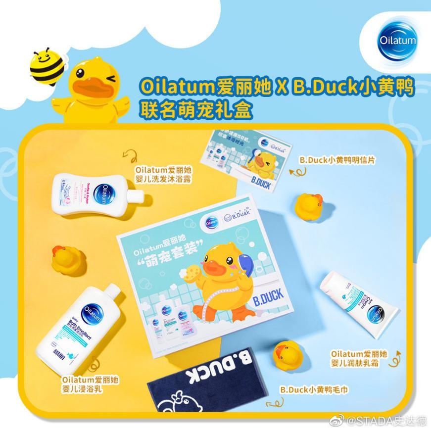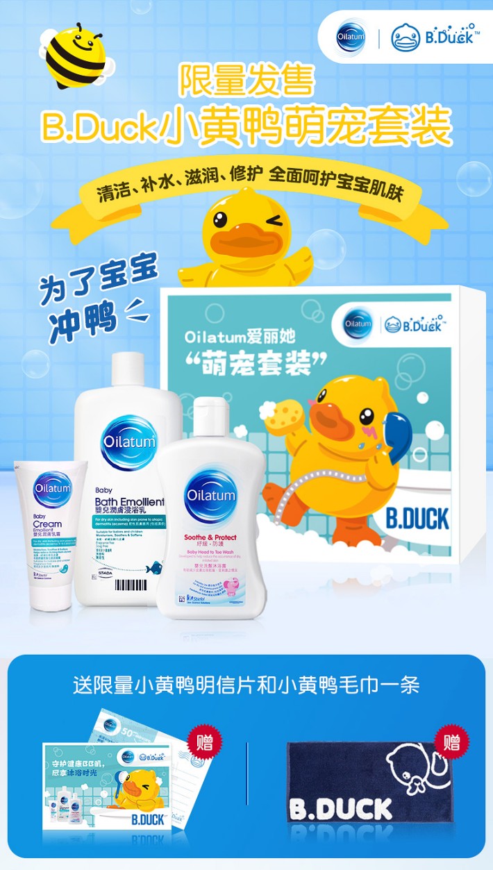萌宠联名,享受沐浴的小时光 小时候最享受的就是在澡盆里沐浴的时光,经典的浮水鸭玩具承载着我们每一个人的童年,小黄鸭和泡泡的超萌搭配,完美让我们成年人也回忆起了童年时光,打造充满泡泡的萌宠感沐浴体验。风靡全球的小黄鸭B.Dcuk携手Oilatum爱丽她跨界联名,为爱造萌,这一次为了宝宝!让我们冲鸭!在呵护宝宝肌肤的同时,增加沐浴的趣味性,让宝宝享受并爱上沐浴的小时光。